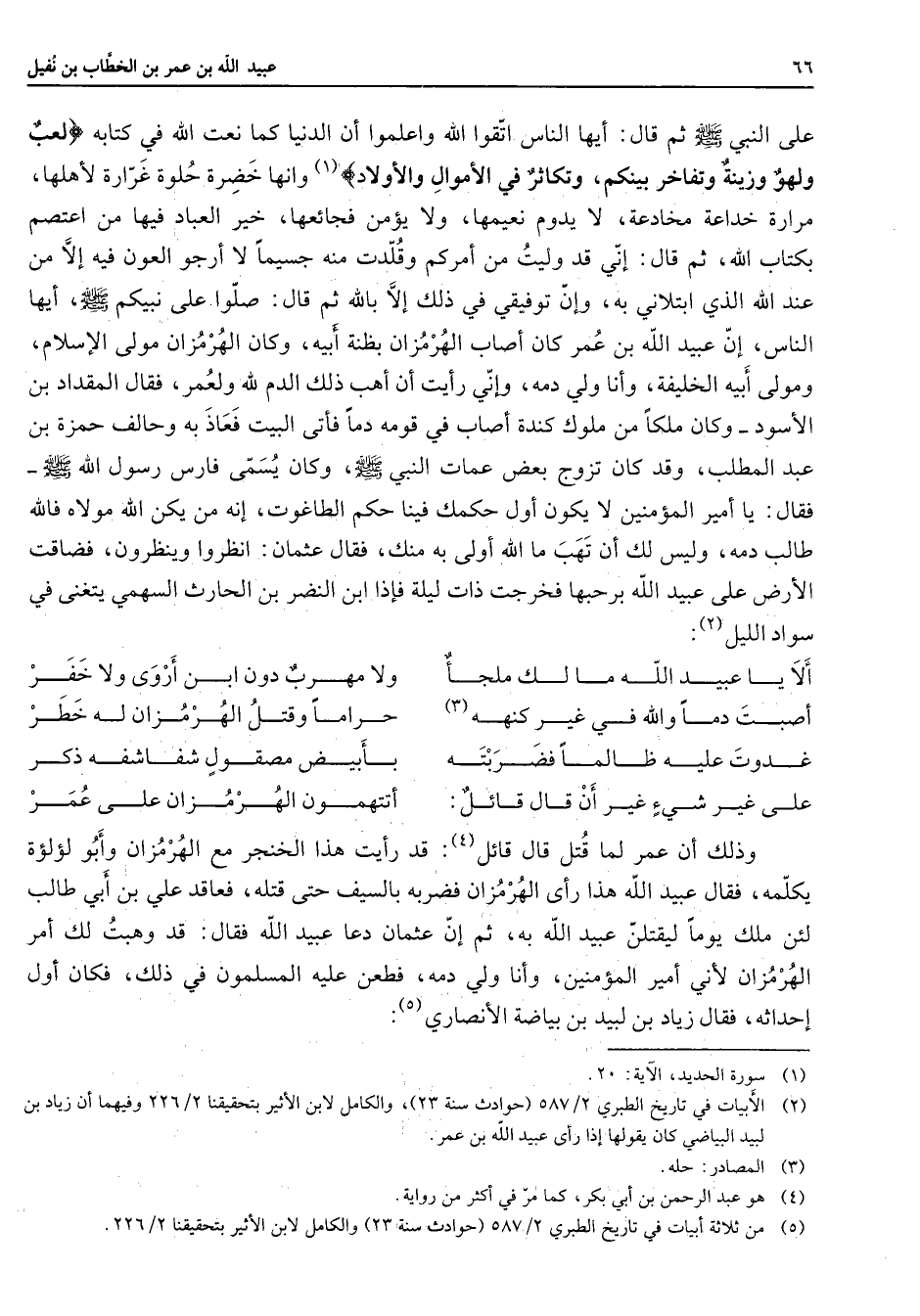 (2) الابيات في تاريخ الطبري 2 / 587 (حوادث سنة 23) والكامل لابن الاثير بتحقيقنا 2 / 226 وفيهما أن زياد بن لبيد البياضي كان يقولها إذا رأى عبيد الله بن عمر