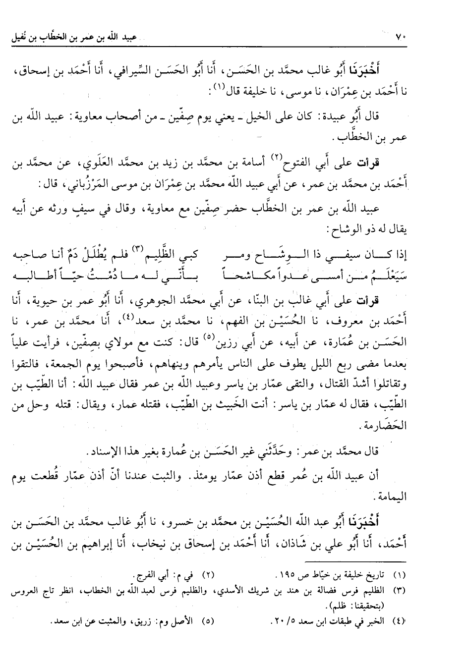 أخبرنا أبو غالب محمد بن الحسن أنا أبو الحسن السيرافي نا أحمد بن إسحاق نا أحمد بن عمران نا موسى نا خليفة قال (1) قال أبو عبيدة كان علي الخيل يعني يوم صفين من أصحاب معاوية عبيد الله بن عمر بن الخطاب قرأت على أبي الفتوح (2) أسامة بن محمد بن زيد بن محمد العلوي عن محمد بن أحمد بن محمد بن عمر عن أبي عبيد الله محمد بن عمران بن موسى المرزباني قال عبيد الله بن عمر بن الخطاب حضر صفين مع معاوية وقال في سيف ورثه عن أبيه يقال له ذو الوشاح * إذا كان سيفي ذا الوشاح ومر * كبي الظليم (3) فلم يطلل دم أنا صاحبه سيعلم من أمسى عدوا مكاشحا * بأني له ما دمت حيا أطالبه * قرأت على أبي غالب بن البنا عن أبي محمد الجوهري أنا أبو عمر بن حيوية أنا أحمد بن معروف نا الحسين بن الفهم نا محمد بن سعد (4) أنا محمد بن عمر نا الحسن بن عمارة عن أبيه عن أبي رزين (5) قال كنت مع مولاي بصفين فرأيت عليا بعدما مضى ربع الليل يطوف على الناس يأمرهم وينهاهم فأصبحوا يوم الجمعة فالتقوا وتقاتلوا أشد القتال والتقى عمار بن ياسر وعبيد الله بن عمر فقال عبيد الله أنا الطيب بن الطيب فقال له عمار بن ياسر أنت الخبيث بن الطيب فقتله عمار ويقال قتله وحل من الحضارمة قال محمد بن عمر وحدثني غير الحسن بن عمارة بغير هذا الإسناد أن عبيد الله بن عمر قطع أذن عمار يومئذ والثبت عندنا أن أذن عمار قطعت يوم اليمامة أخبرنا أبو عبد الله الحسين بن محمد بن خسرو نا أبو غالب محمد بن الحسن بن أحمد أنا أبو علي بن شاذان أنا أحمد بن إسحاق بن نيخاب أنا إبراهيم بن الحسين بن