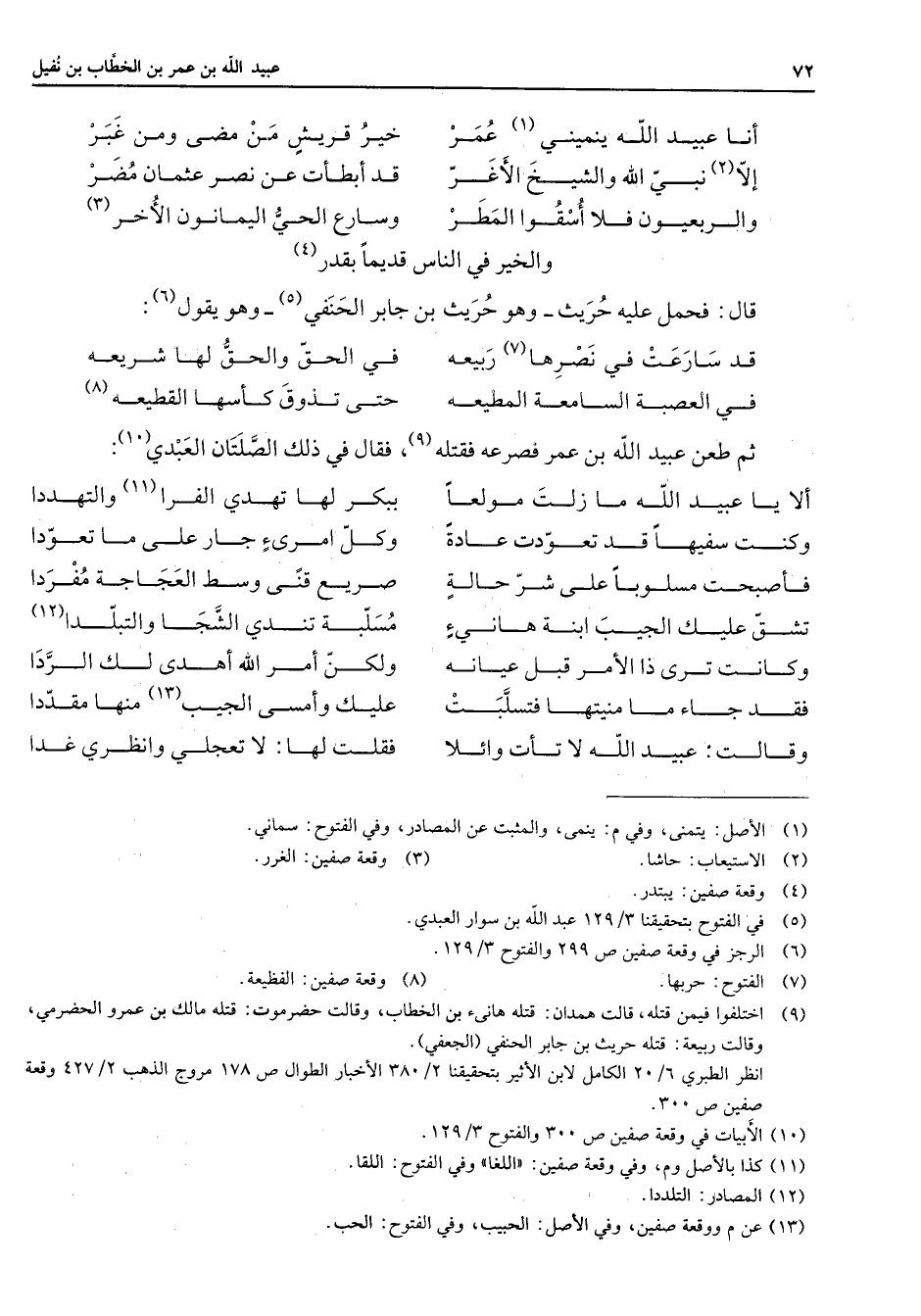 * أنا عبيد الله ينميني (1) عمر * خير قريش من مضى ومن غبر إلا (2) نبي الله والشيخ الأغر * قد أبطأت عن نصر عثمان مضر والربعيون فلا أسقوا المطر * وسارع الحي اليمانون الأخر (3) والخير في الناس قديما بقدر (4) قال فحمل عليه حريث وهو حريث بن جابر الحنفي (5) وهو يقول (6) * قد سارعت في نصرها (7) ربيعه * في الحق والحق لها شريعة * في العصبة السامعة المطيعة * حتى تذوق كأسها القطيعة (8) * ثم طعن عبيد الله بن عمر فصرعه فقتله (9) فقال في ذلك الصلتان العبدي (10) * ألا عبيد الله ما زلت مولعا * ببكر لها تهدي الفرا (11) والتهددا وكنت سفيها قد تعودت عادة * وكل امرئ جار على ما تعودا فأصبحت مسلوبا على شر حالة * صريع قنى وسط العجاجة مفردا تشق عليك الجيب ابنة هانئ * مسلبة تندي الشجا والتبلدا (12) وكانت ترى ذا الأمر قبل عيانة * ولكن أمر الله أهدى لك الردا فقد جاء ما منيتها فتسلبت * عليك وأمسى الجيب (13) منها مقددا وقالت عبيد الله لا تأت وائلا * فقلت لها لا تعجلي وانظري غدا