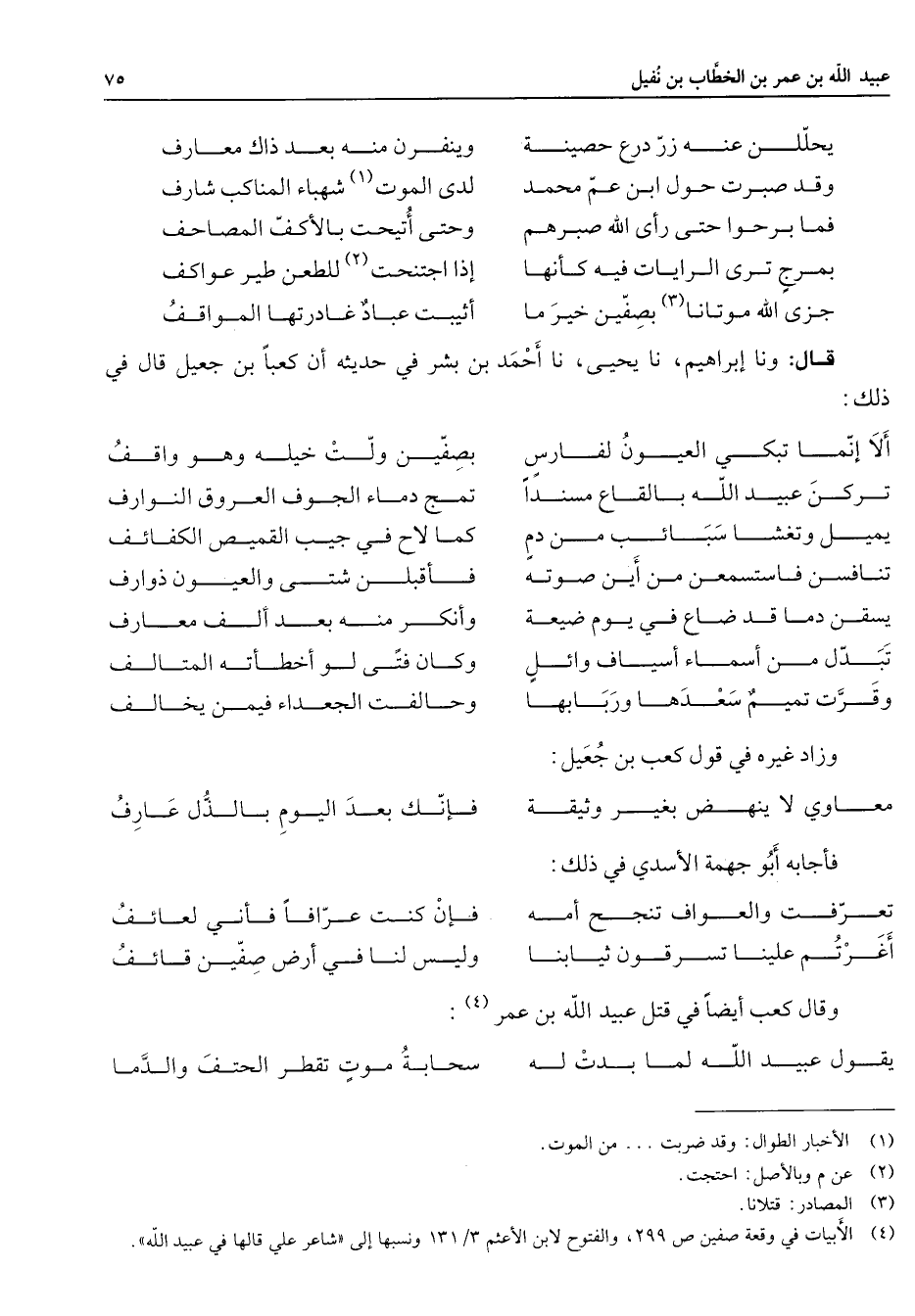 يحللن عنه زردرع حصينة * وينفرن منه بعد ذاك معارف وقد صبرت حول ابن عم محمد * لدى الموت (1) شهباء المناكب شارف فما برحوا حتى رأى الله صبرهم * وحتى أتيحت بالأكف المصاحف بمرج ترى الرايات فيه كأنها * إذا اجتنحت (2) للطعن طير عواكف جزى الله موتانا (3) بصفين خير ما * أثيبت عباد غادرتها المواقف * قال ونا إبراهيم نا يحيى نا أحمد بن بشر في حديثه أن كعبا بن جعيل قال في ذلك * ألا إنما تبكي العيون لفارس * بصفين قد ولت خيله وهو واقف تركن عبيد الله بالقاع مسندا * تمج دماء الجوف العروق النوارف يميل وتغشا سبائب من دم * كما لاح في جيب القميص الكفائف تنافسن فاستسمعن من أين صوته * فأقبلن شتى والعيون ذوارف يسقن دما قد ضاع في يوم ضيعة * وأنكر منه بعد ألف معارف تبدل من أسماء أسياف وائل * وكان فتى لو أخطأته المتالف وقرت تميم سعدها وربابها * وحالفت الجعداء فيمن يخالف * وزاد غيره في قول كعب بن جعيل * معاوي لا ينهض بغير وثيقة * فإنك بعد اليوم بالذل عارف * فأجابه أبو جهمة الأسدي في ذلك * تعرفت والعواف تنجح أمه * فإن كنت عرافا فإني لعائف أغرتم علينا تسرقون ثيابنا * وليس لنا في أرض صفين قائف * وقال كعب أيضا في قتل عبيد الله بن عمر (4) * يقول عبيد الله لما بدت * سحابة موت تقطر الحتف والدما