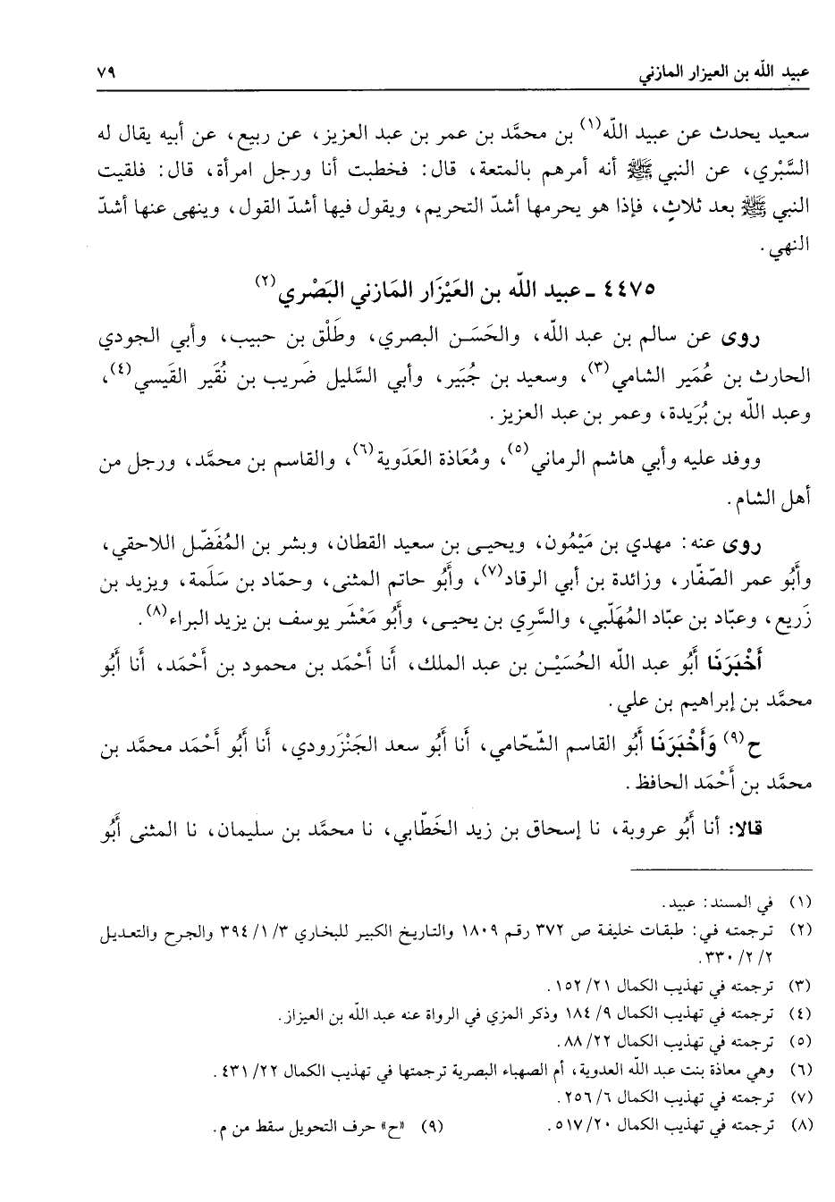 سعيد يحدث عن عبيد الله (1) بن محمد بن عمر بن عبد العزيز عن ربيع عن أبيه يقال له السبر عن النبي (صلى الله عليه وسلم) أنه أمرهم بالمتعة قال فخطبت أنا ورجل امرأة قال فلقيت النبي (صلى الله عليه وسلم) بعد ثلاث فإذا هو يحرمها أشد التحريم ويقول فيها أشد القول وينهى عنها أشد النهي 4475 - عبيد الله بن العيزار المازني البصري (2) روى عن سالم بن عبد الله والحسن البصري وطلق بن حبيب وأبي الجودي الحارث بن عمير الشامي (3) وسعيد بن جبير وأبي السليل ضريب بن نقير القيسي (4) وعبد الله بن بريدة وعمر بن عبد العزيز ووفد عليه وأبي هاشم الرماني (5) ومعاذة العدوية (6) والقاسم بن محمد ورجل من أهل الشام روى عنه مهدي بن ميمون ويحيى بن سعيد القطان وبشر بن المفضل اللاحقي وأبو عمر الصفار وزائدة بن أبي الرقاد (7) وأبو حاتم المثنى وحماد بن سلمة ويزيد بن زريع وعباد بن عباد المهلبي والسري بن يحيى وأبو معشر يوسف بن يزيد البراء (8) أخبرنا أبو عبد الله الحسين بن عبد الملك أنا أحمد بن محمود بن أحمد أنا أبو محمد بن إبراهيم بن علي ح (9) وأخبرنا أبو القاسم الشحامي أنا أبو سعيد الجنزرودي أنا أبو أحمد محمد بن محمد بن أحمد الحافظ قالا أنا أبو عروبة نا إسحاق بن زيد الخطابي نا محمد بن سليمان نا المثنى أبو