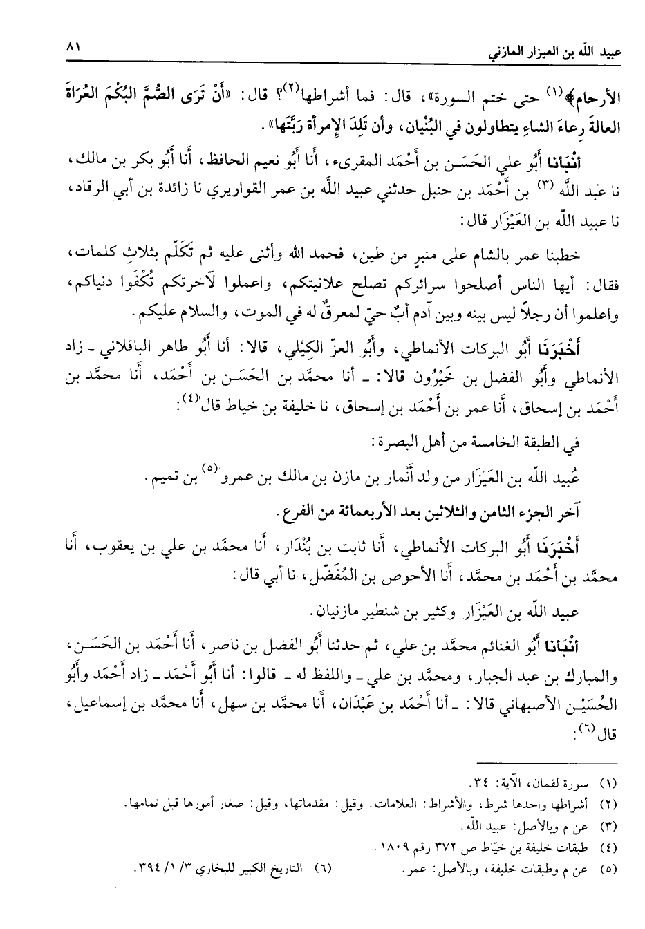 الأرحام (1) حتى ختم السورة قال فما أشرطها (2) قال أن ترى الصم البكم العرا العالة رعاء الشاء يتطاولون في البنيان وأن تلد الإمرأة ربتها أنبأنا أبو علي الحسن بن أحمد المقرئ أنا أبو نعيم الحافظ أنا أبو بكر بن مالك نا عبد الله (3) بن أحمد بن حنبل حدثني عبيد الله بن عمر القواريري نا زائدة بن أبي الرقاد نا عبيد الله بن العيزار قال خطبنا عمر بالشام على منبر من طين فحمد الله وأثنى عليه ثم تكلم بثلاث كلمات فقال أيها الناس أصلحوا سرائركم تصلح علانيتكم واعملوا لآخرتكم تكفوا دنياكم واعلموا أن رجلا ليس بينه وبين آدم أب حي لمعرق له في الموت والسلام عليكم أخبرنا أبو البركات الأنماطي وأبو العز الكيلي قالا أنا أبو طاهر الباقلاني زاد الأنماطي وأبو الفضل بن خيرون قالا أنا محمد بن الحسن بن أحمد أنا محمد بن أحمد بن إسحاق أنا عمر بن أحمد بن إسحاق نا خليفة بن خياط قال (4) في الطبقة الخامسة من أهل البصرة عبيد الله بن العيزار من ولد أنمار بن مازن بن مالك بن عمرو (5) بن تميم آخر الجزء الثامن والثلاثين بعد الأربعمائة من الفرع أخبرنا أبو البركات الأنماطي أنا ثابت بن بندار أنا محمد بن علي بن يعقوب أنا محمد بن أحمد بن محمد أنا الأحوص بن المفضل نا أبي قال عبيد الله بن العيزار وكثير بن شنطير مازنيان أنبأنا أبو الغنائم محمد بن علي ثم حدثنا أبو الفضل بن ناصر أنا أحمد بن الحسن والمبارك بن عبد الجبار ومحمد بن علي واللفظ له قالوا أنا أبو أحمد زاد أحمد وأبو الحسين الأصبهاني قالا أنا أحمد بن عبدان أنا محمد بن سهل أنا محمد بن إسماعيل قال (6) :