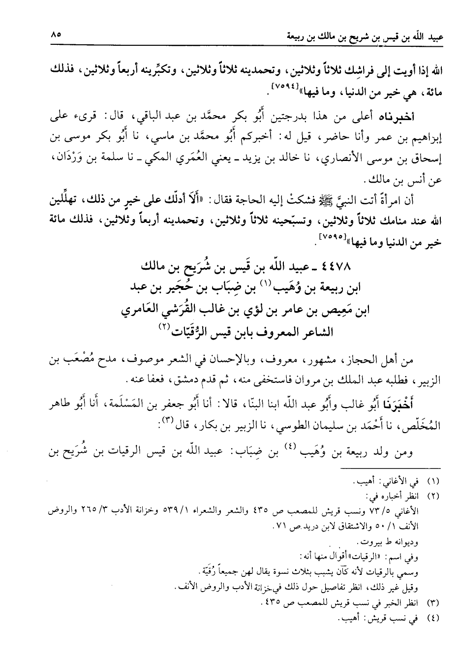 4478 - عبيد الله بن قيس بن شريح بن مالك ابن ربيعة بن وهيب (1) بن ضباب بن حجير بن عبد ابن معيص بن عامر بن لؤي بن غالب القرشي العامري الشاعر المعروف بابن قيس الرقيات (2) من أهل الحجاز مشهور معروف وبالإحسان في الشعر موصوف مدح مصعب بن الزبير فطلبه عبد الملك بن مروان فاستخفى منه ثم قدم دمشق فعفا عنه أخبرنا أبو غالب وأبو عبد الله ابنا البنا قالا أنا أبو جعفر بن المسلمة أنا أبو طاهر المخلص نا أحمد بن سليمان الطوسي نا الزبير بن بكار قال (3) ومن ولد ربيعة بن وهيب (4) بن ضباب عبيد الله بن قيس الرقيات بن شريح بن