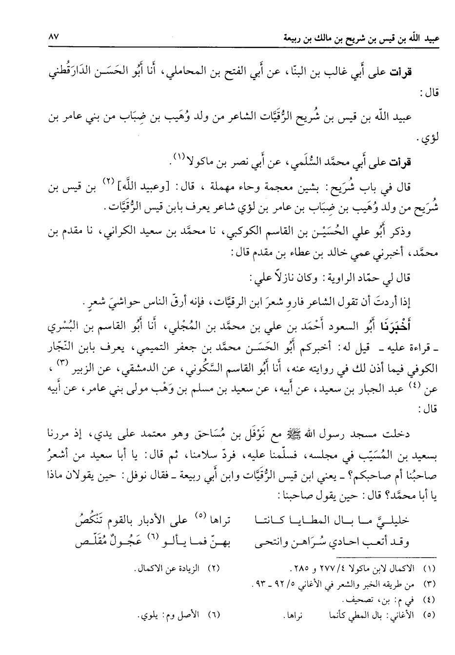 قرأت على أبي غالب بن البنا عن أبي الفتح بن المحاملي أنا أبو الحسن الدارقطني قال عبيد الله بن قيس بن شريح الرقيات الشاعر من ولد وهيب بن ضباب من بني عامر بن لؤي قرأت على أبي محمد السلمي عن أبي نصر بن ماكولا (1) قال في باب شريح بشين معجمة وحاء مهملة قال وعبيد الله (2) بن قيس بن شريح من ولد وهيب بن ضباب بن عامر بن لؤي شاعر يعرف بابن قيس الرقيات وذكر أبو علي الحسين بن القاسم الكوكبي نا محمد بن سعيد الكراني نا مقدم بن محمد أخبرني عمي خالد بن عطاء بن مقدم قال قال لي حماد الراوية وكان نازلا علي إذا أردت أن تقول الشاعر فارو شعر ابن الرقيات فإنه أرق الناس حواشي شعر أخبرنا أبو السعود أحمد بن علي بن محمد بن المجلي أنا أبو القاسم بن البسري قراءة عليه قيل له أخبركم أبو الحسن محمد بن جعفر التميمي يعرف بابن النجار الكوفي فيما أذن لك في روايته عنه أنا أبو القاسم السكوني عن الدمشقي عن الزبير (3) عن (4) عبد الجبار بن سعيد عن أبيه سعيد بن مسلم بن وهب مولى بني عامر عن أبيه قال دخلت مسجد رسول الله (صلى الله عليه وسلم) مع نوفل بن مساحق وهو معتمد على يدي إذ مررنا بسعيد بن المسيب في مجلسه فسلمنا عليه فرد سلامنا ثم قال يا أبا سعيد من أشعر صاحبنا أم صاحبكم يعني ابن قيس الرقيات وابن أبي ربيعة فقال نوفل حين يقولان ماذا يا أبا محمد قال حين يقول صاحبنا * خليلي ما بال المطايا كانتا * تراها (5) على الأدبار بالقوم تنكص وقد أتعب أحادي سراهن وانتحى * بهن فما يألو (6) عجول مقلص