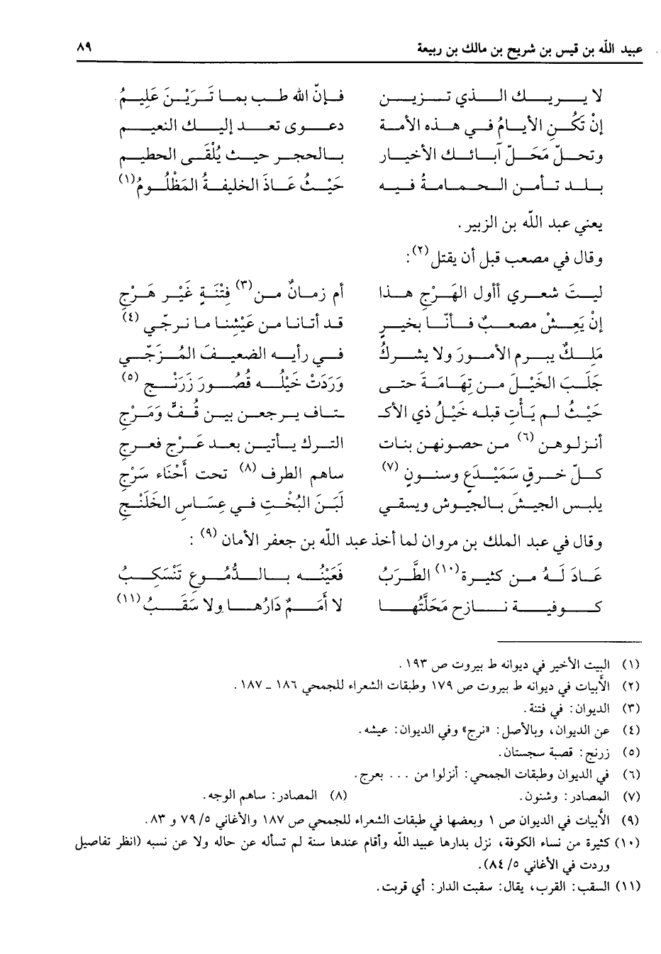 لا يريك الذي تزين * فإن الله طب بما ترين عليم إن تكن الأيام في هذه الأمة * دعوى تعد إليك النعيم وتحل محل آبائك الأخيار * بالحجر حيث يلقى الحطيم بلد تأمن الحمامة فيه * حيث عاد الخليفة المظلوم (1) * يعني عبد الله بن الزبير وقال في مصعب قبل أن يقتل (2) * ليت شعري أأول الهرج هذا * أم زمان من (3) فتنة غير هرج إن يعش مصعب فأنا بخير * قد أتانا من عيشنا ما نرجي (4) ملك يبرم الأمور ولا يشرك في رأيه الضعيف المزجي جلب الخيل من تهامة حتى * وردت خيله قصور زرنج (5) حيث لم يأت قبله خيل ذي الأك * تاف يرجعن بين قف ومرج أنزلوهن (6) من حصونهن بنات * الترك يأتين بعد عرج فعرج كل خرق سميدع وسنون (7) * ساهم الطرف (8) تحت أحناء سرج يلبس الجيش بالجيوش ويسقي * لبن البخت في عساس الخلنج * وقال في عبد الملك بن مروان لما أخذ عبد الله بن جعفر الأمان (9) * عاد له من كثيرة (10) الطرب * فعينه بالدموع تنسكب كوفية نازح محلتها * لا أمم دارها ولا سقب (11)