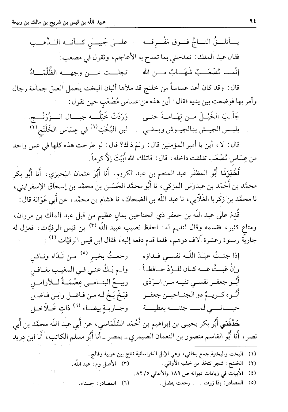 * يأتلق التاج فوق مفرقه * على جبين كأنه الذهب * فقال عبد الملك تمدحني بما تمدح به الأعاجم وتقول في مصعب * إنما مصعب شهاب من الله * تجلت عن وجهه الظلماء * قال وقد كان أعد عساسا من خلنج قد ملأها ألبان البخت يحمل العس جماعة رجال وأمر بها فوضعت بين يديه فقال أين هذه من عساس مصعب حين تقول * جلب الخيل من تهامة حتى * وردت خيله جبال الزرنج يلبس الجيش بالجيوش ويسقي * لبن البخت (1) في عساس الخلنج (2) * قال لا أين يا أمير المؤمنين قال ولم ذاك قال لو طرحت هذه كلها في عس واحد من عساس مصعب تقلقت داخله قال قاتلك الله أبيت إلا كرما أخبرنا أبو المظفر عبد المنعم بن عبد الكريم أنا أبو عثمان البحيري أنا أبو بكر محمد بن أحمد بن عبدوس المزكي نا أبو محمد الحسن بن محمد بن إسحاق الإسفرايني نا محمد بن زكريا الغلابي نا عبد الله بن الضحاك نا هشام بن محمد عن أبي عوانة قال قدم على عبد الله بن جعفر ذي الجناحين بمال عظيم من قبل عبد الملك بن مروان ومتاع كثير فقسمه وقال لنديم له احفظ نصيب عبيد الله (3) بن قيس الرقيات فعزل له جارية ونسوة وعشرة آلاف درهم فلما قدم دفعه إليه فقال ابن قيس الرقيات (4) * إذا جئت عبد الله نفسي فداؤه * رجعت بخير (5) من نداه ونائل وإن غبت عنه كان للود حافظا * ولم يك عني في المغيب بغافل أبو جعفر نفسي تقيه من الردى * ربيع اليتامى عصمة للأرامل أبوه كريم ذو الجناحين جعفر * فبخ بخ من فاضل وابن فاضل حباني لما جئته بعطية * وجارية بيضاء (6) ذات خلاخل * حدثني أبو بكر يحيى بن إبراهيم بن أحمد السلماسي عن أبي عبد الله محمد بن أبي نصر أنا أبو القاسم منصور بن النعمان الصيمري بمصر أنا أبو مسلم الكاتب أنا ابن دريد