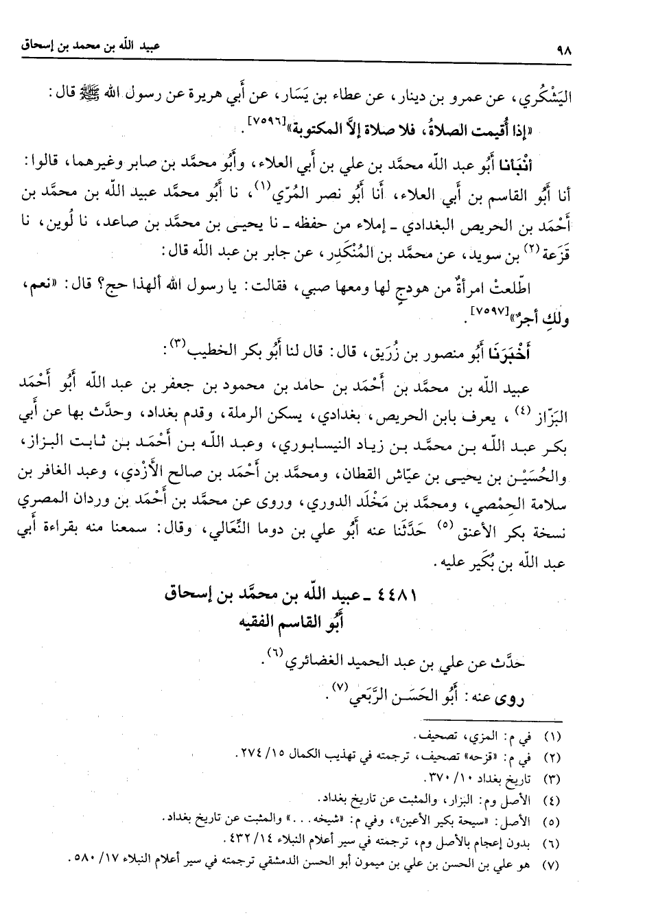 [7597] أخبرنا أبو منصور بن زريق قال قال لنا أبو بكر الخطيب (3) عبيد الله بن محمد بن أحمد بن حامد بن محمود بن جعفر بن عبد الله أبو أحمد البزاز (4) يعرف بابن الحريص بغدادي يسكن الرملة وقدم بغداد وحدث بها عن أبي بكر عبد الله بن محمد بن زياد النيسابوري وعبد الله بن أحمد بن ثابت البزاز والحسين بن يحيى بن عياش القطان ومحمد بن أحمد بن صالح الأزدي وعبد الغافر بن سلامة الحمصي ومحمد بن مخلد الدوري وروى عن محمد بن أحمد بن وردان المصري نسخة بكر الأعنق (5) حدثنا عنه أبو علي بن دوما النعالي وقال سمعنا منه بقراءة أبي عبد الله بن بكير عليه 4481 - عبيد الله بن محمد بن إسحاق أبو القاسم الفقيه حدث عن علي بن عبد الحميد الغضائري (6) روى عنه أبو الحسن الربعي (7)