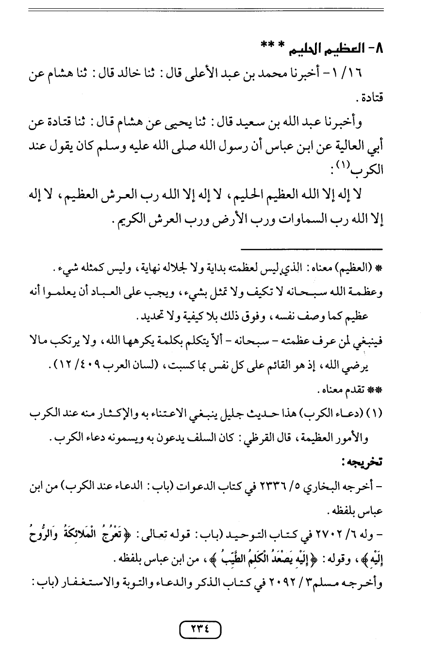 وَأخْبرنَا عبد الله بن سعيد قَالَ ثَنَا يحيى عَن هِشَام قَالَ ثَنَا قَتَادَة عَن أبي الْعَالِيَة عَن ابْن عَبَّاس أَن رَسُول الله صلى الله عَلَيْهِ وَسلم كَانَ يَقُول عِنْد الكرب (لَا إِلَه إِلَّا الله الْعَظِيم الْحَلِيم لَا إِلَه إِلَّا الله رب الْعَرْش الْعَظِيم لَا إِلَه إِلَّا الله رب السَّمَاوَات وَرب الأَرْض وَرب الْعَرْش الْكَرِيم) // أخرجه مُسلم // أخرجه البُخَارِيّ // أخرجه التِّرْمِذِيّ // أخرجه ابْن ماجة //