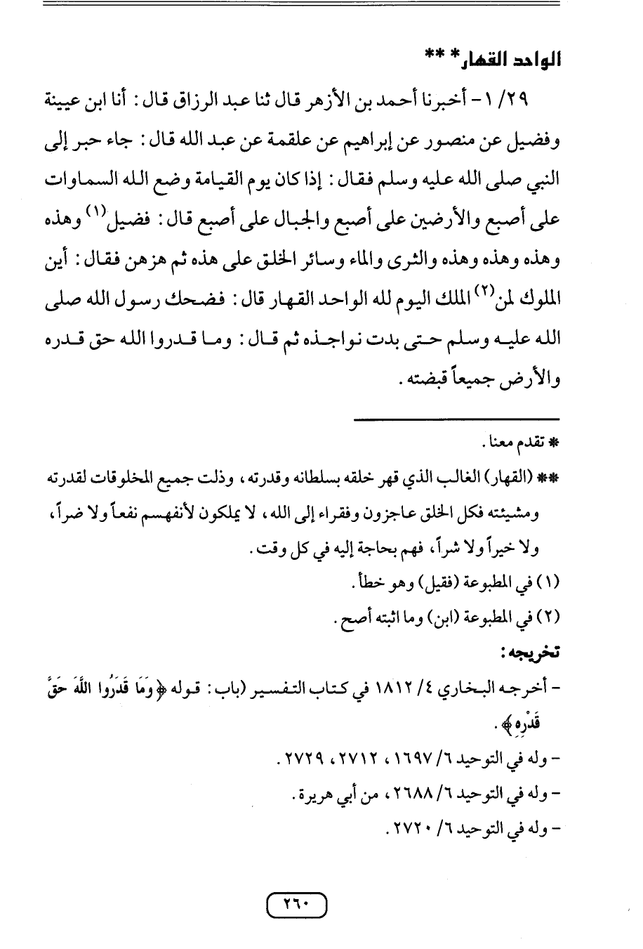 29 - أخبرنَا أَحْمد بن الْأَزْهَر قَالَ ثَنَا عبد الرَّزَّاق قَالَ أَنا ابْن عُيَيْنَة وفضيل عَن مَنْصُور عَن إِبْرَاهِيم عَن عَلْقَمَة عَن عبد الله قَالَ جَاءَ حبر إِلَى النَّبِي صلى الله عَلَيْهِ وَسلم فَقَالَ (إِذا كَانَ يَوْم الْقِيَامَة وضع الله السَّمَاوَات على أصْبع وَالْأَرضين على أصْبع وَالْجِبَال على أصْبع) قَالَ فُضَيْل وَهَذِه وَهَذِه وَهَذِه وَهَذِه وَالثَّرَى وَالْمَاء وَسَائِر الْخلق على هَذِه ثمَّ هزهن فَقَالَ أَيْن الْمُلُوك لمن الْملك الْيَوْم لله الْوَاحِد القهار قَالَ فَضَحِك رَسُول الله صلى الله عَلَيْهِ وَسلم حَتَّى بَدَت نَوَاجِذه ثمَّ قَالَ (وَمَا قدرُوا الله حق قدره وَالْأَرْض جَمِيعًا قَبضته) // أخرجه النَّسَائِيّ // أخرجه التِّرْمِذِيّ // أخرجه ابْن ماجة // أخرجه البُخَارِيّ // أخرجه أَحْمد //
