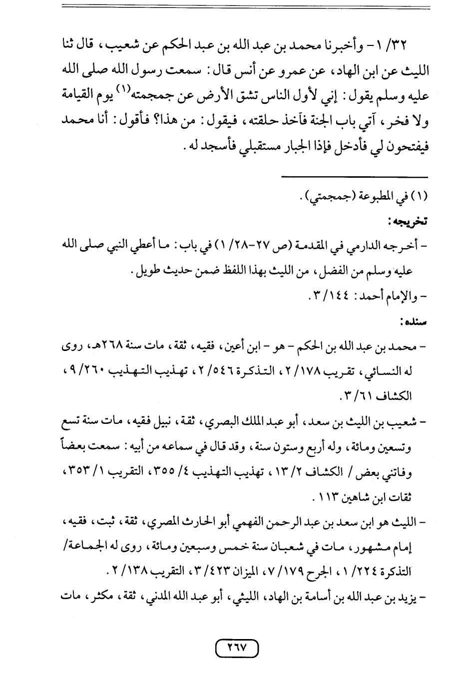 32 - وَأخْبرنَا مُحَمَّد بن عبد الله بن عبد الحكم عَن شُعَيْب قَالَ ثَنَا اللَّيْث عَن ابْن الْهَاد عَن عَمْرو عَن أنس قَالَ سَمِعت رَسُول الله صلى الله عَلَيْهِ وَسلم يَقُول (إِنِّي لأوّل النَّاس تشق الأَرْض عَن جمجمته يَوْم الْقِيَامَة وَلَا فَخر آتِي بَاب الْجنَّة فآخذ حلقته فَيَقُول من هَذَا فَأَقُول أَنا مُحَمَّد فيفتحون لي فَأدْخل فَإِذا الْجَبَّار مستقبلي فأسجد لَهُ) // أخرجه الدَّارمِيّ // أخرجه أَحْمد //
