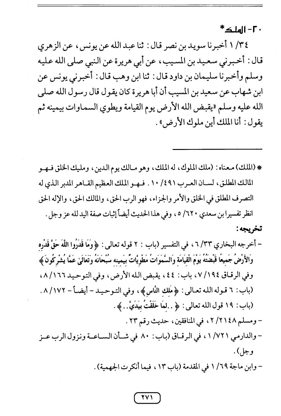 34 أخبرنَا سُوَيْد بن نصر قَالَ ثَنَا عبد الله عَن يُونُس عَن الزُّهْرِيّ قَالَ أَخْبرنِي سعيد بن الْمسيب عَن أبي هُرَيْرَة عَن النَّبِي صلى الله عَلَيْهِ وَسلم وَأخْبرنَا سُلَيْمَان بن دَاوُد قَالَ ثَنَا ابْن وهب قَالَ أَخْبرنِي يُونُس عَن ابْن شهَاب عَن سعيد بن الْمسيب أَن أَبَا هُرَيْرَة كَانَ يَقُول قَالَ رَسُول الله صلى الله عَلَيْهِ وَسلم (يقبض الله الأَرْض يَوْم الْقِيَامَة ويطوي السَّمَاوَات بِيَمِينِهِ ثمَّ يَقُول أَنا الْملك أَيْن مُلُوك الأَرْض) // أخرجه النَّسَائِيّ // أخرجه التِّرْمِذِيّ // أخرجه البُخَارِيّ // أخرجه الدَّارمِيّ // أخرجه ابْن ماجة // أخرجه مُسلم //