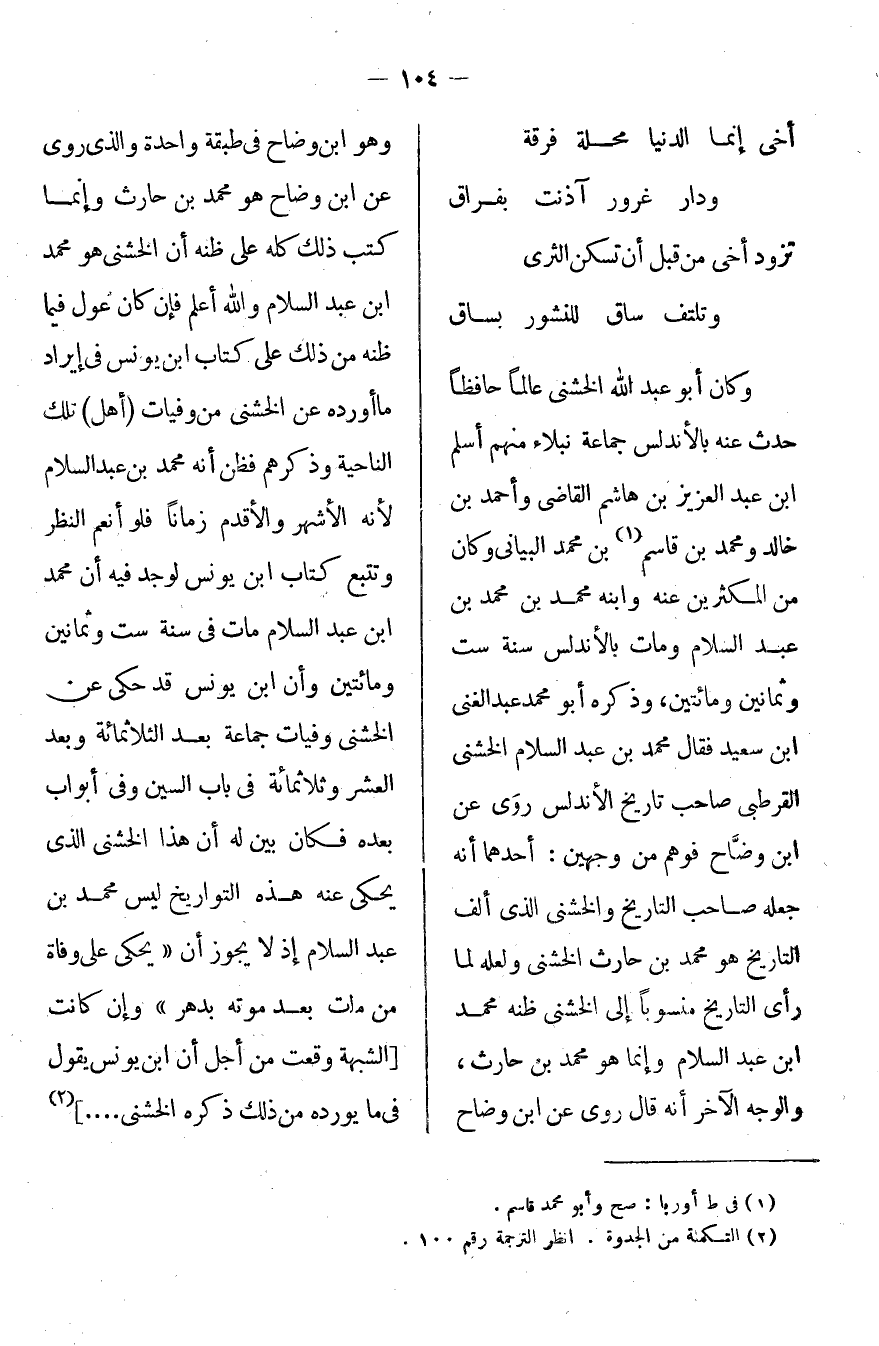 وكان أبو عبد الله الخشني عالماً حافظاً حدث عنه بالأندلس جماعة نبلاء: منهم أسلم بن عبد العزيز بن هاشم القاضي وأحمد بن خالد ومحمد بن قاسم بن محمد البياني وكان من المكثرين عنه محمد عبد الغني بن سعيد فقال محمد بن عبد السلام الخشني القرطبي صاحب تاريخ الأندلس، روى عن ابن وضاح فوهم من وجهين: أحدهما أنه جعله صاحب التاريخ والخشني الذي ألف التاريخ هو محمد بن حارث الخشني ولعله لما رأى التاريخ منسوباً إلى الخشني ظنه محمد بن عبد السلام وإنما هو محمد بن حارث، والوجه الآخر أنه قال روى عن ابن وضاح وهو وابن وضاح في طبقة واحدة والذي روى عن ابن وضاح هو محمد بن حارث وإنما كتب ذلك كله على ظنه أن الخشني هو محمد بن عبد السلام والله أعلم فإن كان عول فيما ظنه من ذلك على كتاب ابن يونس في إيراد ما أورده عن الخشني من وفات [أهل] تلك الناحية وذكرهم فظن أنه محمد بن عبد السلام لأنه الأشهر والأقدم زماناً فلو أمعن النظر وتتبع كتاب ابن يونس لوجد فيه أن محمد بن عبد السلام مات في سنة ست وثمانين ومائتين وأن ابن يونس قد حكى عن الخشني وفيات جماعة بعد الثلاثمائة وبعد العشر وثلاثمائة في باب السين وفي أبواب بعده فكان بين له أن هذا الخشني الذي يحكي عنه هذه التواريخ ليس محمد بن عبد السلام إذ لا يجوز أن "يحكى على وفاة من مات بعد موته بدهر" وإن كان [الشبهة وقعت من أجل أن ابن يونس يقول في ما يورده من ذلك ذكره الخشني ... ]