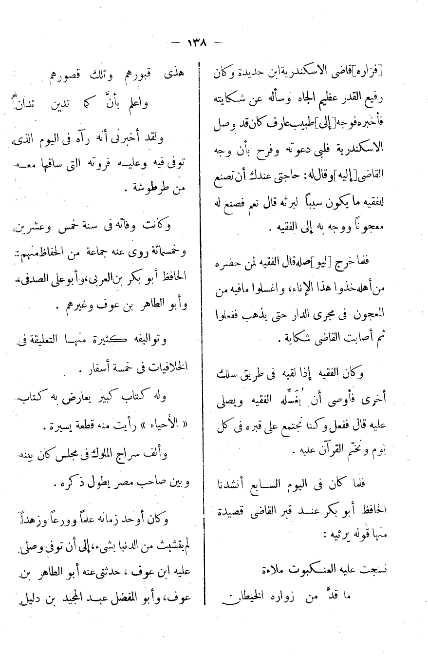 [فزاره] قاضي الإسكندرية ابن حديدة وكان رفيع القدر عظيم الجاهس وسأله عن شكايته فأخبره فوجه [إلى] طبيب عارف كان قد وصل الإسكندرية فلبى دعوته وفرح بأن وجه القاضي [إليه] وقال له: حاجتي عندك أن تضع للفقيه ما يكون سبباً لبرئه قال: نعم، فصنع له معجوناً ووجه به إلى الفقيه.