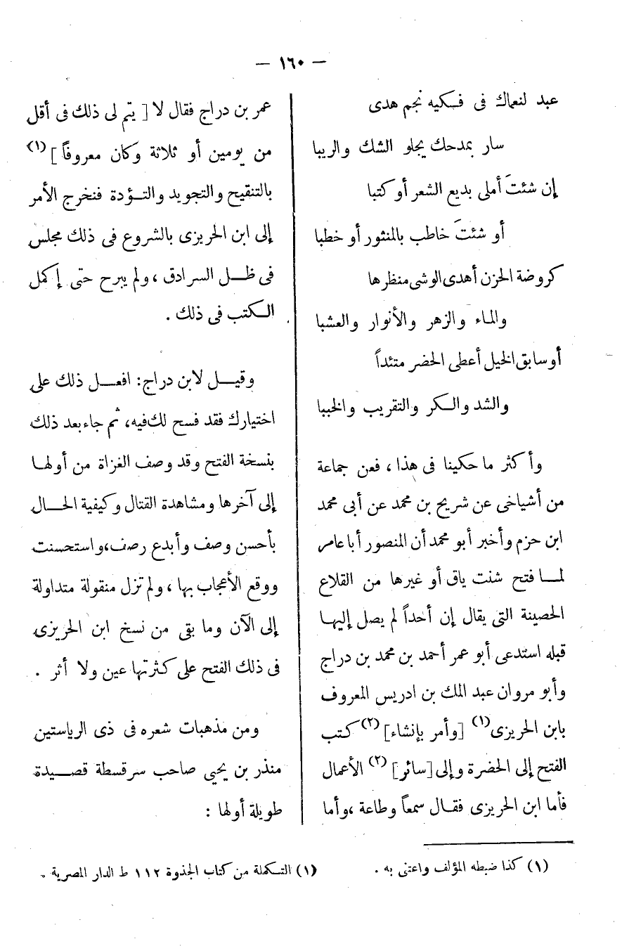 وأكثر ما حكينا في هذا، فعن جماعة من أشياخي عن شريح بن محمد عن أبي محمد بن حزم وأخبر أبو محمد أن المنصور أبا عامر لما فتح شنت ياق أو غيرها من القلاع الحصينة التي يقال إن أحداً لم يصل إليها قبله استدعى أبو عمر أحمد بن محمد ابن دراج وأبو مروان عبد الملك بن إدريس المعروف بابن الحريزي [وأمر بإنشاء] كتب الفتح إلى الحضرة وإلى [سائر] الأعمال فأما ابن الحريزي فقال سمعاً وطاعة، وأما عمر بن دراج فقال: لا [يتم لي في أقل من يومين أو ثلاثة وكان معروفاً] بالتنقيح والتجويد والتؤدة فخرج الأمر إلى ابن الحريزي بالشروع في ذلك فجلس في ظل السرادق، ولم يبرح حتى أكمل الكتب في ذلك.