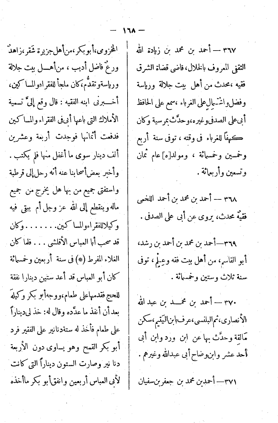 367- أحمد بن محمد بن زيادة الله الثقفي المعروف بالخلال: قاضي قضاة الشرق فقيه، محدث من أهل بيت جلالة ورياسة وفضل واشتمال على الغرباء، سمع علي الحافظ أبي علي الصدفي وغيره، وحدث بمرسية وكان كهفاً للغرباء في وقته، توفى سنة أربع وخمسين وخمسمائة، ومولده عام ثمان وتسعين وأربعمائة.