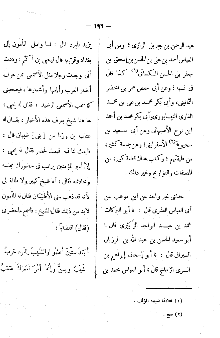 حدثني غير واحد عن ابن موهب عن أبي العباس العذري قال: أخبرنا أبو البركات محمد بن عبد الواحد الزبيري قال: أخبرنا أبو سعيد الحسن بن عبد الله بن المرزبان السيرافي قال: أخبرنا أبو إسحاق إبراهيم بن السري الزجاج قال أخبرنا أبو العباس محمد بن يزيد المبرد قال: لما وصل المأمون إلى بغداد وقر بها قال ليحيى بن أكثم: وددت أني وجدت رجلاً مثل الأصمعي ممن عرف أخبار العرب وأيامها وأشعارها، فيصحبني كما صحب الأصمعي الرشيد، فقال له يحيى: هاهنا شيخ يعرف هذه الأخبار، يقال له عتاب بن ورنا من [بني] شيبان قال: فابعث لنا فيه فبعث فحضر فقال له يحيى: إن أمير المؤمنين يرغب في حضورك مجلسه ومحادثته فقال: أنا شيخ كبير ولا طاقة لي لأنه قد ذهب مني الأطيبان فقال له المأمون: لابد من ذلك فقال الشيخ: فاسمع ما حضرني [فقال] اقتضاباً: