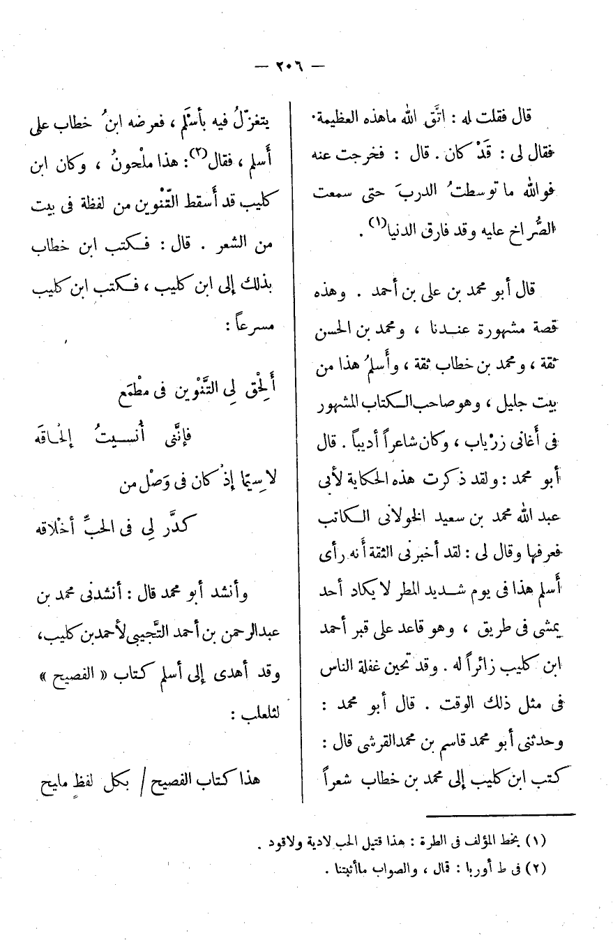 وأنشد أبو محمد قال: أنشدني محمد بن عبد الرحمن بن أحمد التجيبي لأحمد بن كليب، وقد أهدى إلى أسلم كتاب "الفصيح" لثعلب: