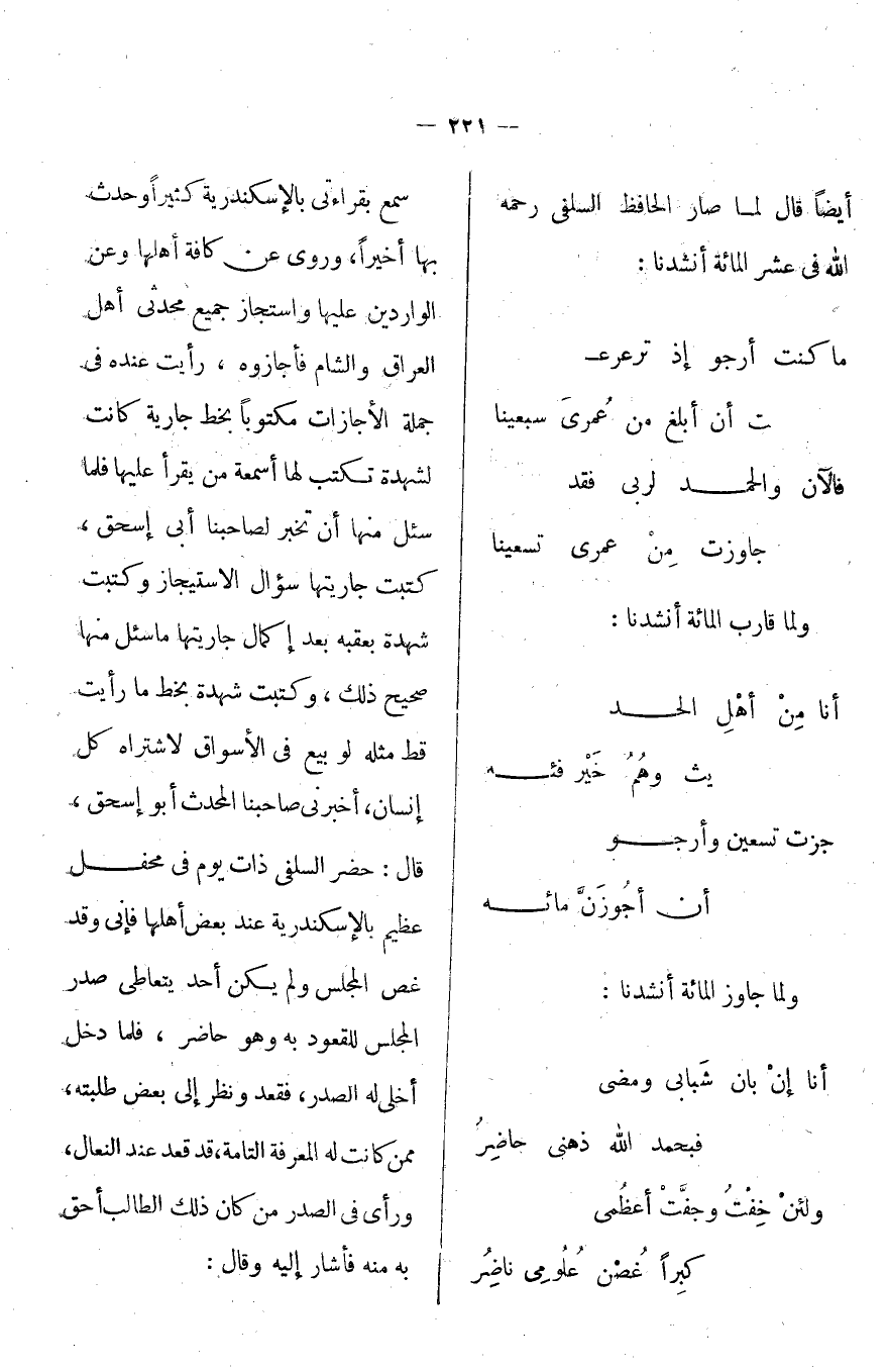 أيضاً قال: لما صار الحافظ السلفي رحمه الله في عشر المائة أنشدها: