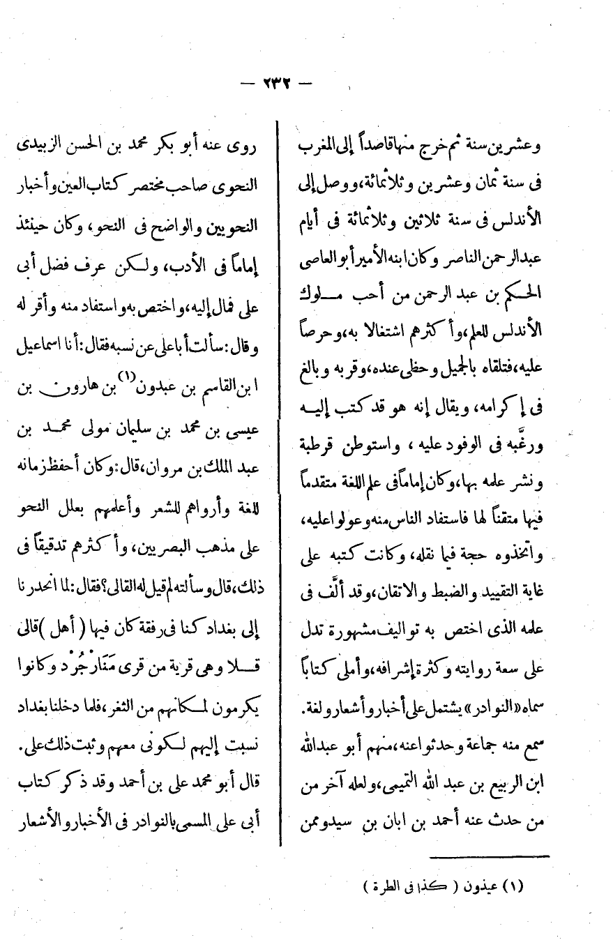 وعشرين سنة ثم خرج منها قاصداً إلى المغرب في سنة ثمان وعشرين وثلاثمائة، ووصل إلى الأندلس في سنة ثلاثين وثلاثمائة في أيام عبد الرحمن الناصر وكان ابنه الأمير أبو العاصي الحكم بن عبد الرحمن من أحب ملوك الأندلس للعلم، وأكثرهم اشتغالاً به، وحرصاً عليه، فتلقاه بالجميل وحظي عنده، وقربه وبالغ في إكرامه، ويقال إنه قد كتب إليه ورغبة في الوفود عليه، واستوطن قرطبة ونشر علمه بها، وكان إماماً فيي علم اللغة متقدماً لها فاستفاد الناس منه وعولوا عليه، واتخذوه حجة فيما نقله، وكانت كتبه على غاية التقييد والضبط والإتقان، وقد ألف في علمه الذي اختص به تواليف مشهورة تدل على سعة روايته وكثرة إشرافه، وأملى كتاباً سماه "النوادر" يشتمل على أخبار وأشعار ولغة، سمع منه جماعة وحدثوا عنه، منهم أبو عبد الله بن الربيع ابن عبد الله التميمي، ولعله آخر من حدث عنه أحمد بن أبان بن سيد ومن روى عنه أبو بكر محمد بن الحسن الزبيدي النحوي صاحب مختصر كتاب العين وأخبار النحويين والواضح في النحو، وكان حينئذ إماماً في الأدب، ولكن عرف فضل أبي على فمال إليه، واختص به واستفاد منه وأقر له وقال: سألت أبا علي عن نسبه فقال: أخبرنا إسماعيل بن القاسم بن عبدون بن هارون بن عيسى بن محمد بن سليمان مولى محمد بن عبد الملك بن مروان، قال: وكان أحفظ زمانه للغة وأرواهم للشعر وأعلمهم بعلل النحو على مذهب البصريين، وأكثرهم تدقيقاً في ذلك، قال: وسألته لم قيل له القالي؟ فقال: لما انحدرنا إلى بغداد كنا في رفقة كان فيها [أهل] قالي قلا وهي قرية من قرى نارجرد وكانوا يكرمون لمكانهم من الثغر، فلما دخلنا بغداد نسبت إليهم لكوني معهم وثبت ذلك علي، قال أبو محمد علي بن أحمد: وقد ذكر كتاب أبى علي المسمى بالنوادر في الأخبار والأشعار
