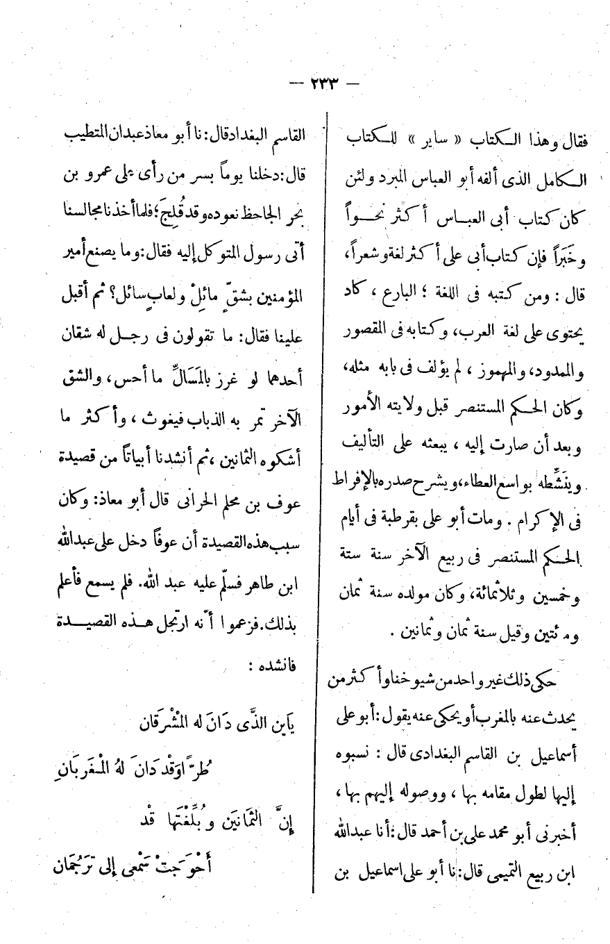 فقال: وهذا الكتاب "ساير" للكتاب الكامل الذي ألفه أبو العباس المبرد ولئن كان كتاب أبي العباس أكثر نحواً وخبراً فإن كتاب أبي علي أكثر لغة وشعراً، قال: ومن كتبه في اللغة "البارع" كان يحتوي على لغة العرب، وكتاب في المقصور والممدود والمهموز، لم يؤلف في بابه مثله، وكان الحكم المستنصر قبل ولايته الأمور وبعد أن صارت إليه، يبعثه على التأليف وينشطه بواسع العطاء، ويشرح صدره بالإفراط في الإكرام، ومات أبو علي بقرطبة في أيام الحكم المستنصر في ربيع الآخر سنة ستة وخمسين وثلاثمائة، وكان مولده سنة ثمان ومائتين وقيل سنة ثمان وثمانين.