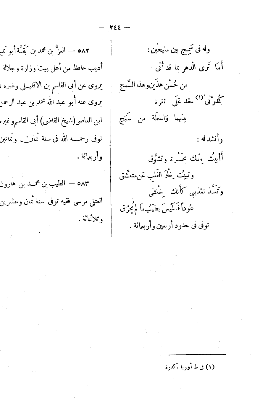 أديب حافظ من أهل بيت وزارة وجلالة، يروى عن أبي القاسم بن الأفليلي وغيره، يروى عنه أبو عبد الله محمد بن عبد الرحمن بن العاصي [شيخ القاضي] أبى القاسم وغيره توفى رحمة الله في سنة ثمان وثمانين وأربعمائة.