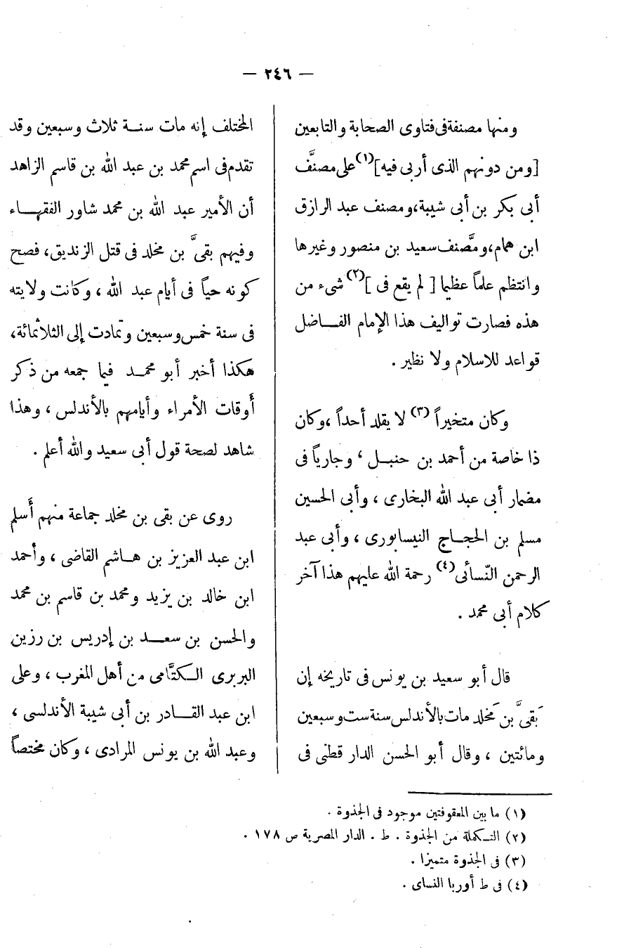 وكان مخيراً لا يقلد أحداً، وكان ذا خاصة من أحمد بن حنبل، وجارياً في مضمار أبي عبد الله البخاري، وأبي الحسين مسلم بن الحجاج النيسابوري، وأبي الرحمن النسائي رحمه الله عليهم هذا آخر كلام أبي محمد.