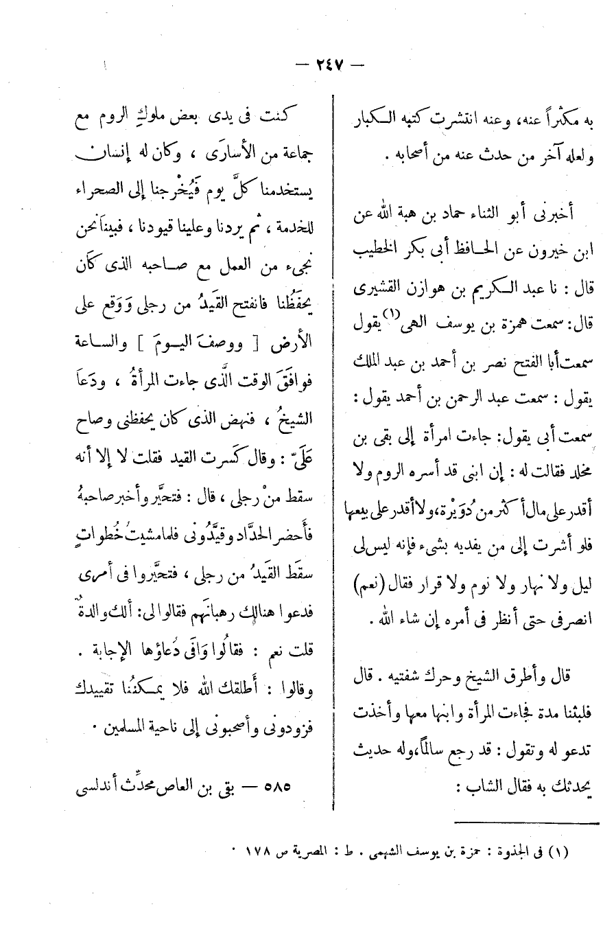 أخبرني أبو الثناء حماد بن هبة الله عن بن خيرون عن الحافظ أبي بكر الخطيب قال: أخبرنا عبد الكريم بن هوازن القشيري قال: سمعت همزة بن يوسف إلهي يقول: سمعت أبا الفتح نصر بن أحمد بن عبد الملك يقول: سمعت عبد الرحمن بن أحمد يقول: سمعت أبي يقول: جاءت امرأة إلى بقى بن مخلد فقالت له: إن ابني قد أسره الروم ولا أقدر على مال أكثر من دويرة، ولا أقدر على بيعها فلو أشرت إلى من يفديه بشيء فإنه ليس لي ليل ولا نهار ولا نوم ولا قرار فقال: [نعم] انصرفي حتى أنظر في أمره إن شاء الله.