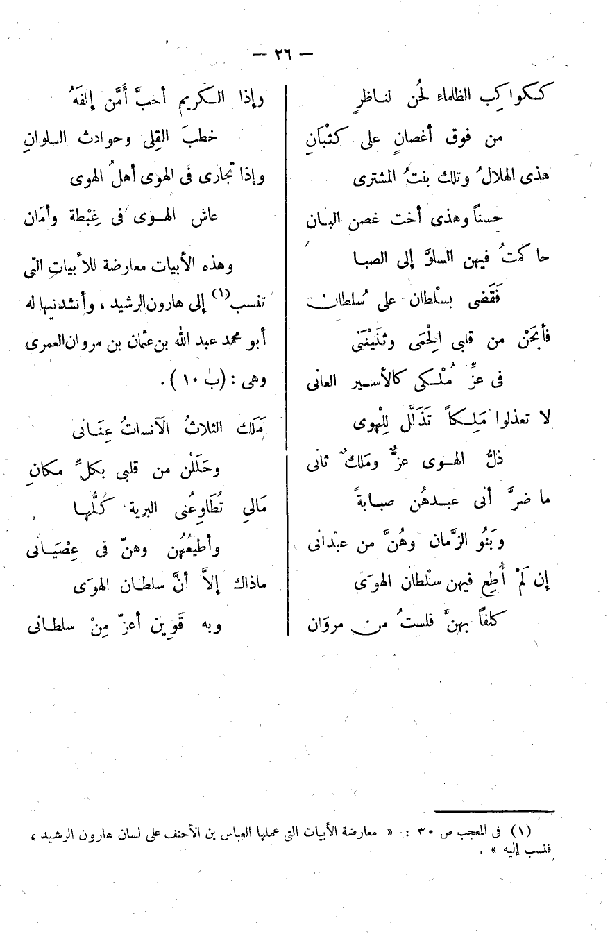 وهذه الأبيات معارضة للأبيات التي تنسب إلى هارون الرشيد، وأنشدنيها له أبو محمد عبد الله بن عثمان بن مروان العمري وهي: