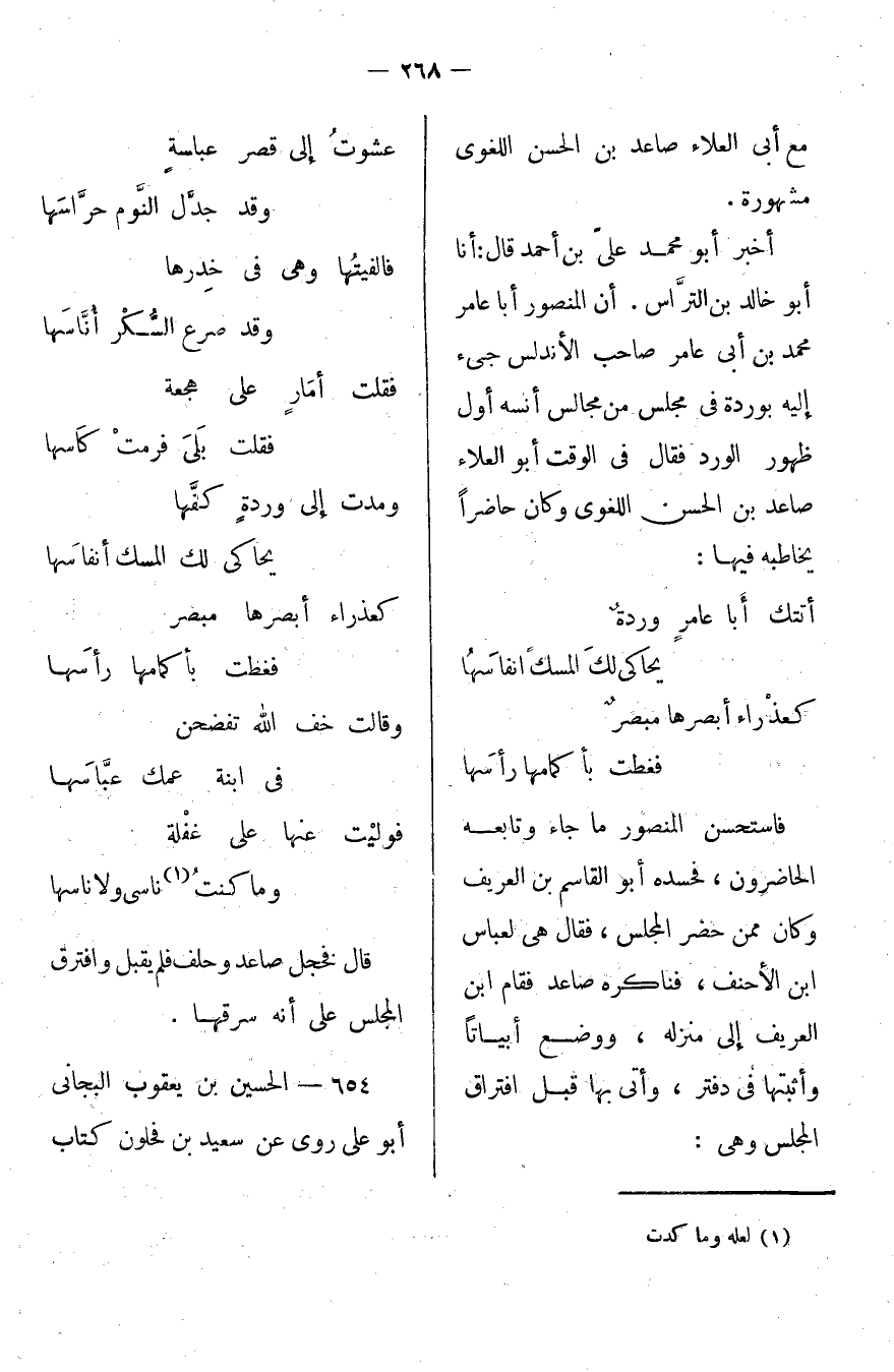 أخبر أبو محمد علي بن أحمد قال: أخبرنا أبو خالد بن التراس أن المنصور أبا عامر محمد بن أبي عامر صاحب الأندلس جيء إليه بوردة في مجلس من مجالس أنسه أول ظهور الورد فقال في الوقت أبو العلاء صاعد بن الحسن اللغوي، وكان حاضراً يخاطبه فيها: