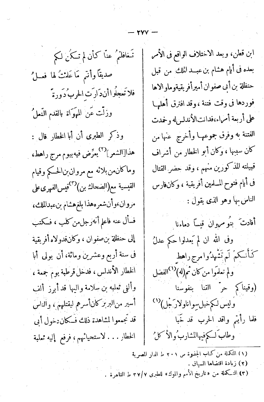 بن قطن، وبعد الاختلاف الواقع في الأمر بعده في أيام هشام بن عبد الملك من قبل حنظلة بن أبي صفوان أمير إفريقية وما والاها فوردها في وقت فتنة، وقد افترق أهلا على أربع أمراء، فدانت الأندلس له وخمدت الفتنة به وفرق جموعها وأخرج عنها من كان سببها، وكان أبو الخطار من أشراف قبيلته المذكورين منهم، وقد حضر القتال في أيام فتوح المسلمين إفريقية، وكان فارس الناس بها وهو الذي يقول: