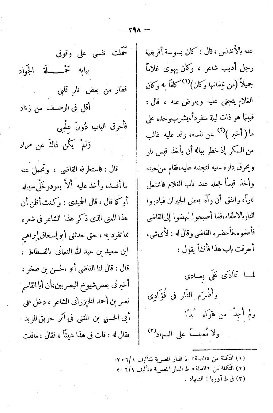 عنه بالأندلس، قال: كان بسوسة إفريقية رجل أديب شاعر، وكان يهوى غلاماً جميلاً [من غلمانها وكان] كلفاً به وكان الغلام يتجنى عليه ويعرض عنه، قال: فبينما هو ذات ليلة منفرداً، يشرب وحده على ما [أخبر] عن نفسه، وفد عليه غالب من السكر إذ خطر بباله أن يأخذ قبس نار ويحرق داره عليه لتجنيه عليه، فقام من حينه وأخذ قبساً فجعله عند باب الغلام فاشتعل ناراً، واتفق أن رآه بعض الجيران فبادروا النار بالإطفاء، فلما أصبحوا نهضوا إلى القاضي فأعلموه، فأحضر القاضي وقال له: لأي شيء أحرقت باب هذا فأنشأ يقول: