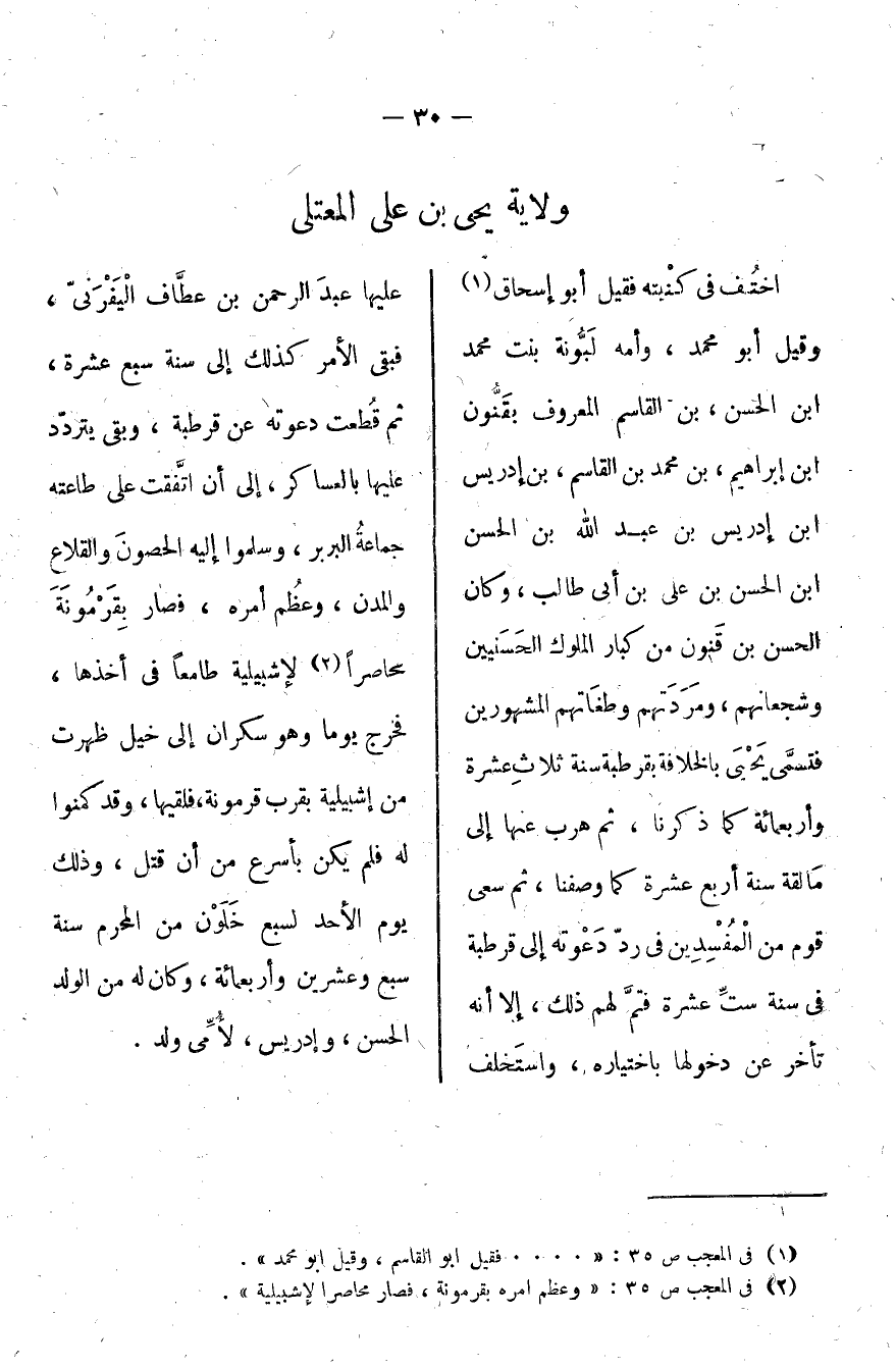 اختلف في كنيته فقيل أبو إسحاق وقيل أبو محمد، وأمه لبونة بنت محمد بن الحسن بن القاسم المعروف بقنون بن إبراهيم بن محمد بن القاسم بن إدريس بن إدريس بن عبد الله بن الحسن بن الحسن بن علي بن أبي طالب، وكان الحسن بن قنون من كبار الملوك الحسنيين وشجعانهم، ومردتهم وطغاتهم المشهورين فتسمى يحيى بالخلافة بقرطبة سنة ثلاث عشرة وأربعمائة كما ذكرنا، ثم هرب عنها إلى مالقة سنة أربع عشرة كما وصفناه، ثم سعى قوم من المفسدين في رد دعوته إلى قرطبة في سنة ست عشرة فتم لهم ذلك، إلا أنه تأخر عن دخولها باختياره، واستخلف عليها عبد الرحمن بن عطاف اليفرني، فبقي الأمر كذلك إلى سنة سبع عشرة، ثم قطعت دعوته عن قرطبة، وبقي يتردد عليها بالعساكر، إلى أن اتفقت على طاعته جامعة البربر، وسلموا إليه الحصون والقلاع والمدن، وعظم أمره، فصار بقرمونة محاصراً لإشبيلية طامعاً في أخذها، فخرج يوماً وهو سكران إلى خيل ظهرت من إشبيلية بقرب قرمونة، فلقيها، وقد كمنوا له فلم يكن بأسرع من أن قتل، وذلك يوم الأحد لسبع خلون من المحرم سنة سبع وعشرين وأربعمائة، وكان له من الولد الحسن، وإدريس، لأمي ولد.