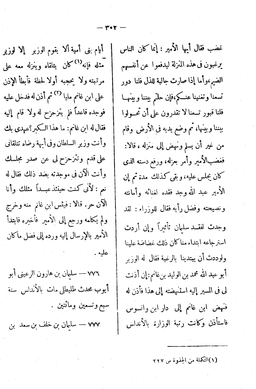 غضب فقال أيها الأمير: إنما كان الناس يرغبون في هذه المنزلة ليدفعوا عن أنفسهم الضيم، وأما إذا صارت جالبة للذل فلنا دور تسعنا وتغنينا عنكم، فإن حلتم بيننا وبينها فلنا قبور تسعنا لا تقدرون على أن تحولوا بيننا وبينها، ثم وضع يديه في الأرض وقام من غير أن يسلم ونهض إلى منزله، قالا: فغضب الأمير وأمر بعزله، ورفع دسته الذي كان يجلس عليه، وبقي كذلك مدة ثم إن الأمير عبد الله وجد فقده لغنائه وأمانته ونصيحته وفضل رأيه فقال للوزراء: لقد وجدت لفقد سليمان تأثيراً وإن أردت استرجاعه ابتداء منا كان ذلك غضاضة علينا ولوددت أن يبتدينا بالرغبة فقال له الوزير أبو عبد الله محمد بن الوليد بن غانم: إن أذنت لي في المسير إليه استنهضته إلى هذا فأذن له فنهض ابن غانم إلى دار ابن وانسوس فاستأذن وكانت رتبة الوزارة بالأندلس أيام بني أمية ألا يقوم الوزير إلا لوزير مثله فإنه كان يتلقاه وينزله معه على مرتبته ولا يحجبه ولا لحظة فأبطاً الإذن على ابن غانم ملياً ثم أذن له فدخل عليه فوجده قاعداً فلم يتزحزح له ولا قام إليه فقال له ابن غانم: ما هذا الكبر؟ عهدي بك وأنت وزير السلطان وفي أبهة راضه تتلقاني على قدم وتتزحزح لي عن صدر مجلسك وأنت الآن في موجدته بضد ذلك فقال له: نعم لأني كنت حينئذ عبداً مثلك وأنا الآن حر. قال: فيئس ابن غانم وخرج ولم يكلمه ورجع إلى الأمير فأخبره فابتدأ الأمير بالإرسال إليه ورده إلى أفضل ما كان عليه.