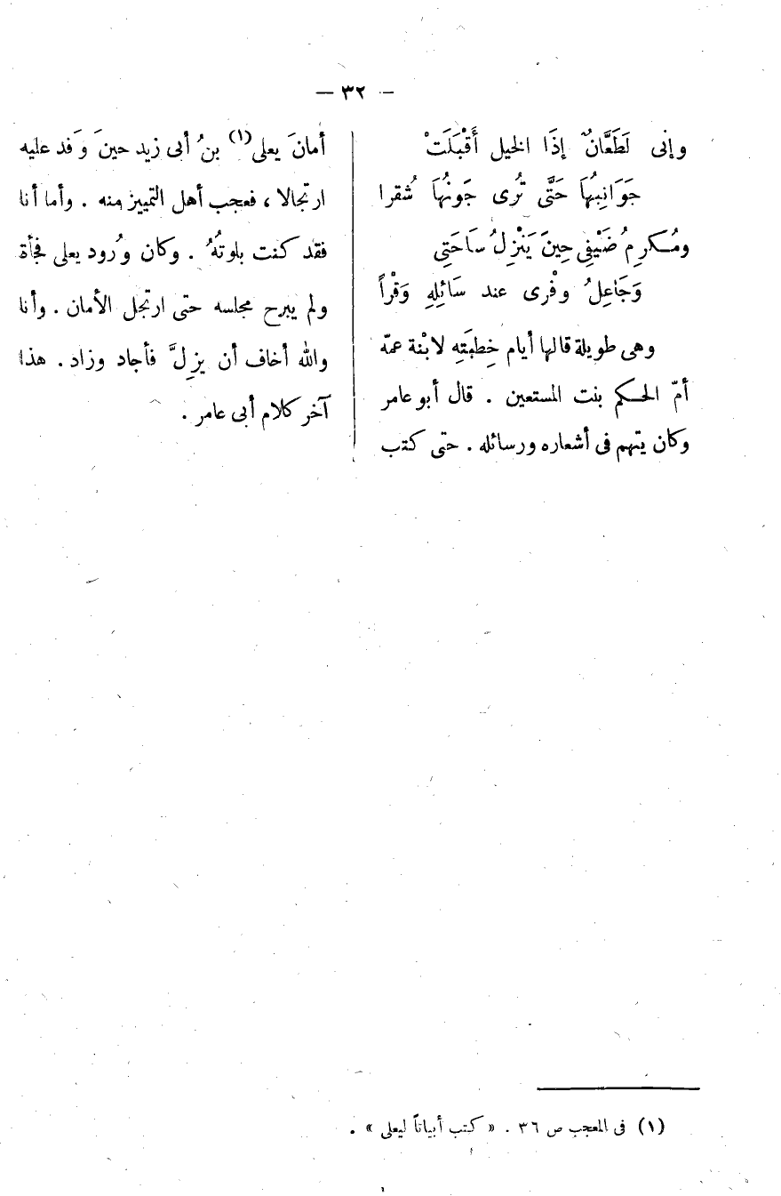 وهي طويلة قالها أيام خطبته لابنة عمه أم الحكم بنت المستعين، قال أبو عامر وكان يتهم في أشعاره ورسائله، حتى كتب أمان يعلي بن أبي زيد حين وقد عليه ارتجالاً، فعجب أهل التمييز منه. وأما أنا فقد كنت بلوته، وكان ورود يعلي فجأة ولم يبرح مجلسه حتى ارتجل الأمان، وأنا والله أخاف أن يزل فأجاد وزاد، هذا آخر كلام أبي عامر.