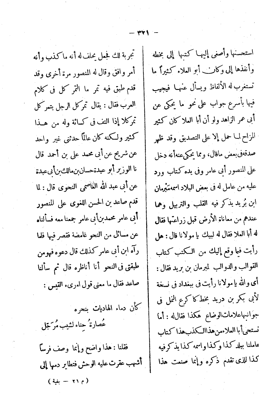 استحسنها وأصغى إليها، كتبها إلي بخطه وأنفذها إلي. وكان أبو العلاء كثيراً ما تستغرب له الألفاظ ويسأل عنها فيجيب فيها بأسرع جواب على نحو ما يحكى عن أبي عمر الزاهد، ولو أن أبا العلاء كان كثير المزاح لما حمل إلا على التصديق وقد ظهر صدقه في بعض ما قال، ومما يحكى عنه أنه دخل على المنصور أبي عامر وفي يده كتاب ورد عليه من عامل له في بعض البلاد اسمه مبرمان بن يزيد يذكر فيه القلب والتربيل وهما عندهم من معاناة الأرض قبل زراعتها، فقال له: أبا العلاء. فقال له: لبيك يا مولانا. قال: هل رأيت فيما وقع إليك من الكتب كتاب القوالب والدوالب لمبرمان بن بريد؟ فقال: أي والله يا مولانا رأيت في بغداد في نسخة لأبي بكر بن دريد بخط كأكرع النمل في جوانبها علامات الوضاع هكذا. فقال له: أما تستحي أبا العلاء من هذا الكذب هذا كتاب عاملنا ببلد كذا وكذا واسمه كذا يذكر فيه كذا للذي تقدم ذكره وإنما صنعت هذا تجربة لك فجعل يحلف له أنه ما كذب وأنه أمر وافق. وقال له المنصور مرة أخرى وقد قدم طبق فيه تمر: ما التمر كل في كلام العرب؟ فقال: يقال تمر كل الرجل يتمر كل تمر كلا إذا التف في كسائه. وله من هذا كثير.