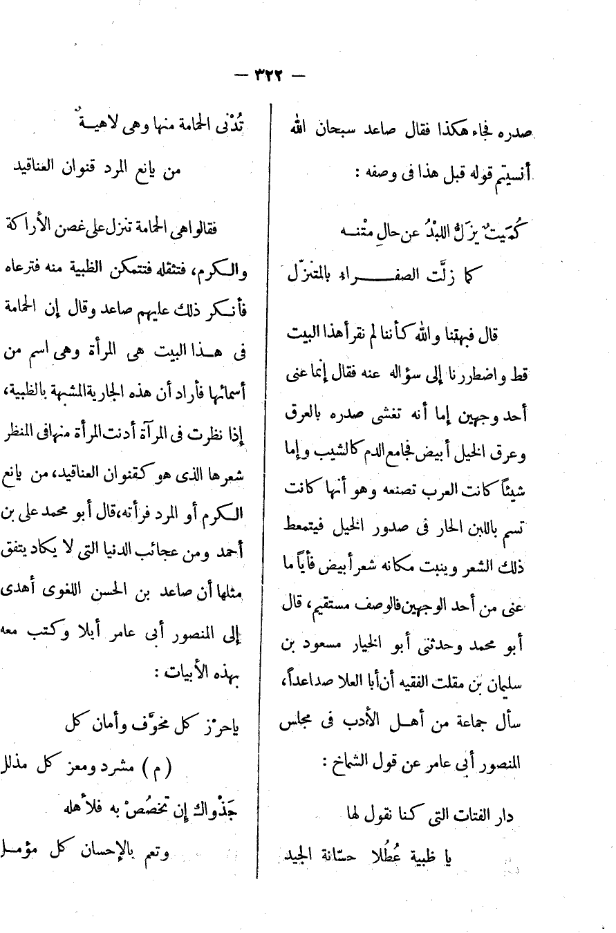 فقالوا: هي الحمامة تنزل على غصن الأراكة والكرم، فتنقله فتتمكن الظبية منه فترعاه، بأنكر ذلك عليهم صاعد وقال: إن الحمامة في البيت هي المرأة وهي اسم من أسمائها فأراد أن هذه الجارية المشبهة بالظبية، إذا نظرت في المرآة أدنت المرآة منها في المنظر شعرها الذي هو كقنوان العناقيد، من يانع الكرم أو المرد فرأته، قال أبو محمد علي بن أحمد: ومن عجائب الدنيا التي لا تكاد يتفق مثلها أن صاعد بن الحسن اللغوي أهدى إلى المنصور أبي عامر أيلاً وكتب معه بهذه الأبيات:
