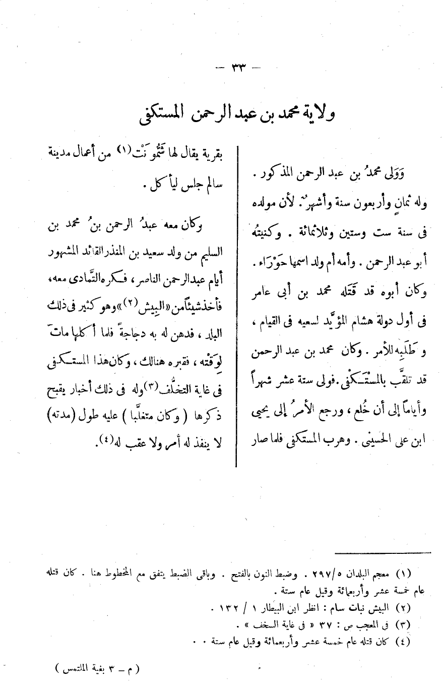 وولي محمد بن عبد الرحمن المذكور، وله ثمان وأربعون سنة وأشهر، لأن مولده في سنة ست وستين وثلاثمائة، وكنيته أبو عبد الرحمن، وأمه أم ولد اسمها [حوراء] . وكان أبوه قد قتله محمد بن أبي عامر في أول دولة هشام المؤيد لسعيه في القيام، وطلبه للأمر، وكان محمد بن عبد الرحمن قد تلقب بالمستكفي، فولي ستة عشر شهراً وأياماً إلى أن خلع، ورجع الأمر إلى يحيى بن علي الحسيني، وهرب المستكفي فلما صار بقرية يقال لها شمونت من أعمال مدينة سالم جلس ليأكل وكان معه عبد الرحمن بن محمد بن السليم من ولد سعيد بن المنذر القائد المشهور أيام عبد الرحمن الناصر، فكره التمادي معه، فأخذ شيئاً من [البيش] وهو كثير في ذلك البلد، فدهن له به دجاجة فلما أكلها مات لوقته، فقبره هنالك، وكان هذا المستكفي في غاية التخلف وله في ذلك أخبار يقبح ذكرها [وكان متغلباً] عليه طول [مدته] لا ينفذ له أمر ولا عقب له.
