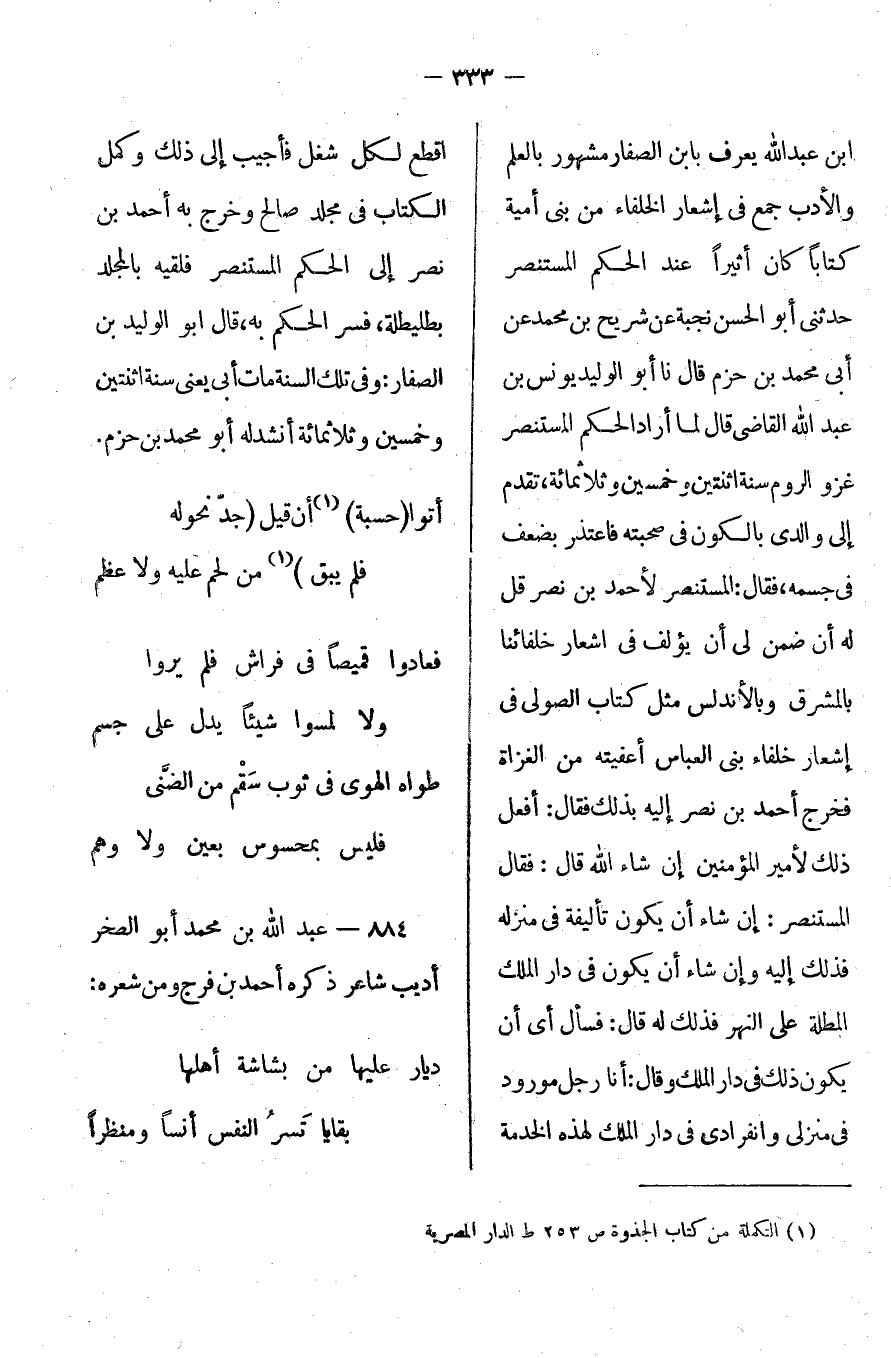 بن عبد الله يعرف بابن الصفار مشهور بالعلم والأدب جمع في أشعار الخلفاء من بني أمية كتاباً، كان أثيراً عند الحكم المستنصر حدثني أبو الحسن نجبة عن شريح بن محمد عن أبي محمد بن حزم قال: أخبرنا أبو الوليد يونس بن عبد الله القاضي قال: لما أراد الحكم المستنصر غزو اليوم سنة اثنتين وخمسين وثلاثمائة، تقدم إلى والدي بالكون في صحبته فاعتذر بضعف في جسمه، [فقال] : المستنصر لأحمد بن نصر قل له إن ضمن لي أن يؤلف في أشعار خلفائنا بالمشرق وبالأندلس مثل كتبا الصولي في أشعار خلفاء بني العباس أعفيته من الغزاة. فخرج أحمد بن نصر إليه بذلك فقال: أفعل ذلك لأمير المؤمنين إن شاء الله قال: فقال المستنصر: إن شاء أن يكون تأليفه في منزله فذلك إليه وإن شاء أن يكون في دار الملك المطلة على النهر فذلك له. قال: فسأل، أي يكون ذلك في دار الملك وقال: أنا رجل مورود في منزلي وانفرادي في دار الملك لهذه الخدمة أقطع لكل شغل فأجيب إلى ذلك وكمل الكتاب في مجلد صالح وخرج به أحمد بن نصر إلى الحكم المستنصر فلقيه بالمجلد بطليطلة، فسر الحكم به، قال أبو الوليد بن الصفار: وفي تلك السنة مات أبي، يعني سنة اثنتين وخمسين وثلاثمائة أنشد له أبو محمد بن حزم: