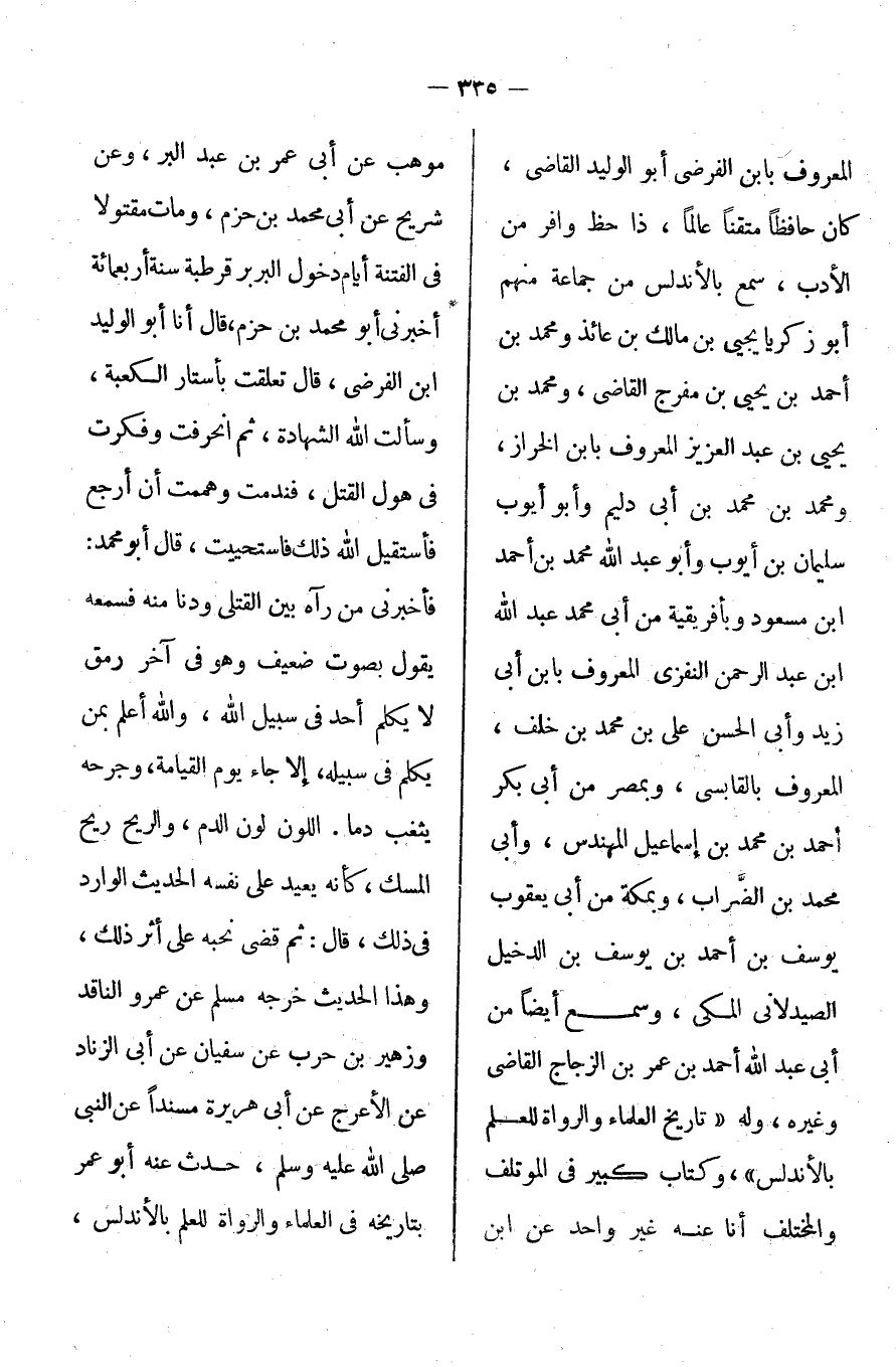 كان حافظاً متقناً عالماً، ذا حظ وافر في الأدب، سمع بالأندلس من جماعة منهم أبو زكريا يحيى بن مالك بن عائذ. ومحمد بن أحمد بن يحيى بن مفرج القاضي، ومحمد بن يحيى بن العزيز المعروف بابن الخراز، ومحمد بن محمد بن أبي دليم وأبو أيوب سليمان بن أيوب وأبو عبد الله محمد بن أحمد بن مسعود وبأفريقية من أبي محمد عبد الله بن عبد الرحمن النفزي المعروف بابن أبي زيد وأبي الحسن علي بن محمد بن خلف، المعروف بالقابسي، وبمصر من أبي بكر أحمد بن محمد بن إسماعيل المهندس، وأبي محمد بن الضراب، وبمكة من أبي يعقوب يوسف بن أحمد بن يوسف بن الدخيل الصيدلاني المكي، وسمع أيضاً من أبي عبد الله أحمد بن عمر بن الزجاج القاضي وغيره، وله "تاريخ العلماء الرواة للعلم بالأندلس"، وكتاب كبير في المؤتلف والمختلف أخبرنا عنه غير واحد عن ابن موهب عن أبي عمر بن عبد البر، وعن شريح عن أبي محمد بن حزم. ومات مقتولاً في الفتنة أيام دخول البربر قرطبة سنة أربعمائة أخبرني أبو محمد بن حزم، ومات مقتولاً في الفتنة أيام دخول البربر قرطبة سنة أربعمائة أخبرني أبو محمد بن حزم، قال أخبرنا أبو الوليد بن الفرضي، قال: تعلقت بأستار الكعبة، وسألت الله الشهادة، ثم انحرفت وفكرت في هول القتل، فندمت وهممت أن أرجع فأستقيل الله ذلك فاستحييت، قال أبو محمد: فأخبرني من رآه بين القتلى ودنا منه فسمعه يقول بصوت ضعيف وهو في آخر رمق: "لا يكلم أحد من سبيل الله والله أعلم بمن يكلم في سبيله، إلا جاء يوم القيامة، وجرحه يثغب دما، اللون لون الدم، والريح ريح المسك". كأنه يعيد على نفسه الحديث الوارد في ذلك، قال: ثم قضى نحبه على أثر ذلك، وهذا الحديث خرجه مسلم عن عمرو الناقد وزهير بن حرب عن سفيان عن أبي الزناد عن الأعرج عن أبي هريرة مسنداً عن النبي (صلى الله عليه وآله وسلم) ، حدث عنه أبو عمر بتاريخه في العلماء والرواة للعلم بالأندلس،