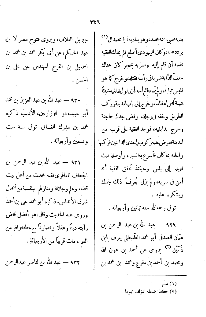 يديه صبي اسمه محمد، وهو ينادي: يا محمدال يردد هذا، وكان اليهودي أصلع فلم يملك الفقيه نفسه أن قام إليه وضربه بحجر كان هناك خلف الدابة ضربة في رأسه فقتله، وخرج كما هو فلبس ثيابه، ولم يستطيع أحد أن يقول للفقيه شيئاً هيبة له وإعظاماً، وخرج إلى باب المدينة وركب الطريق وخفه في رجله، وقضى جدك حاجته وخرج بدابتيه، فوجد الفقيه على قرب من المدينة فعرض عليه ركوب إحدى الدابتين فركبها وأعلمه بما كان فأسرع به السير، وأوصله تلك الليلة إلى بلس وحينئذ تحقق الفقيه أنه أمن في سربه، ولم يزل يعرف ذلك لجدك ويشكره عليه.