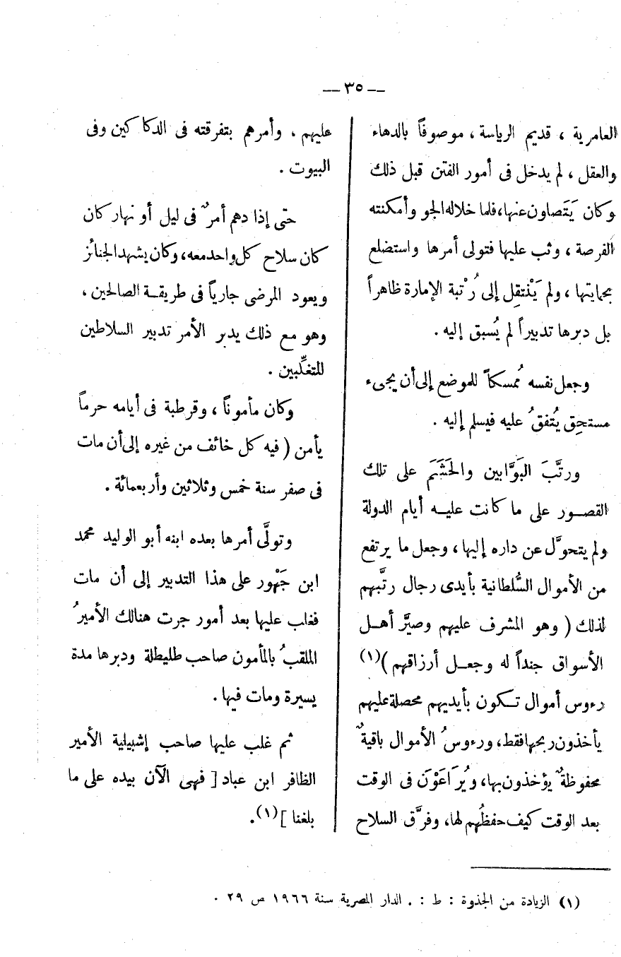 ورتب البوابين والحشم على تلك القصور على ما كانت عليه أيام الدولة ولم يتحول عن داره إليها، وجعل ما يرتفع من الأموال السلطانية بأيدي رجال رتبهم لذلك [وهو المشرف عليهم وصير أهل الأسواق جنداً له وجعل أرزاقهم] رؤوس أموال تكون بأيديهم محصلة عليهم يأخذون ربحها فقط، ورؤوس الأموال باقية محفوظة يؤخذون بها، ويراعون في الوقت بعد الوقت كما حفظهم لها، وفرق السلاح عليهم، وأمرهم بتفرقته في الدكاكين وفي البيوت.
