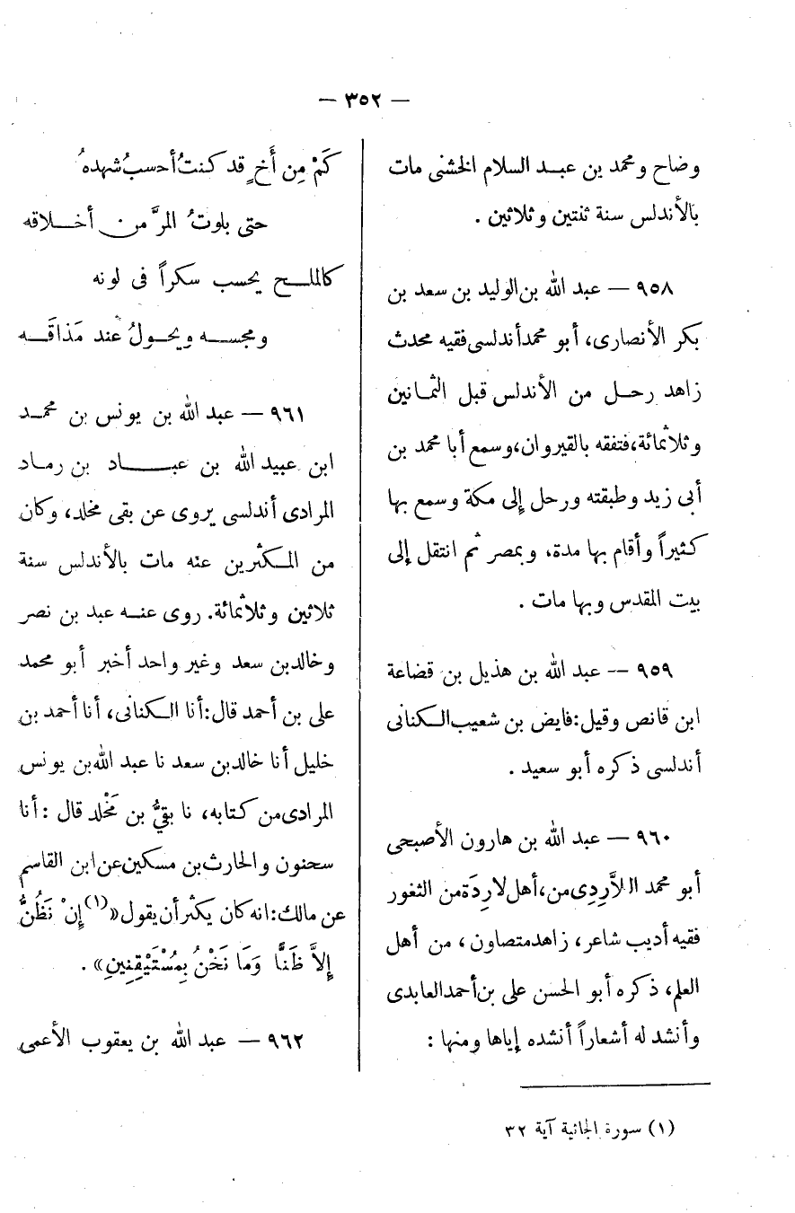 أندلسي يروى عن بقى بن مخلد، وكان من المكثرين عنه، مات بالأندلس سنة ثلاثين وثلاثمائة، روى عنه عبد بن نصر وخالد بن سعد وغير واحد اخبر أبو محمد علي بن أحمد قال: أخبرنا الكناني، أخبرنا أحمد بن خليل أخبرنا خالد بن سعد أخبرنا عبد الله بن يونس المرادي من كتابه، أخبرنا بقى بن مخلد قال: أخبرنا سحنون والحارث بن مسكين عن ابن القاسم عن مالك: أنه كان يكثر أن يقول: {إن نظن إلا ظناً وما نحن بمستيقنين} [الجاثية: 32] .