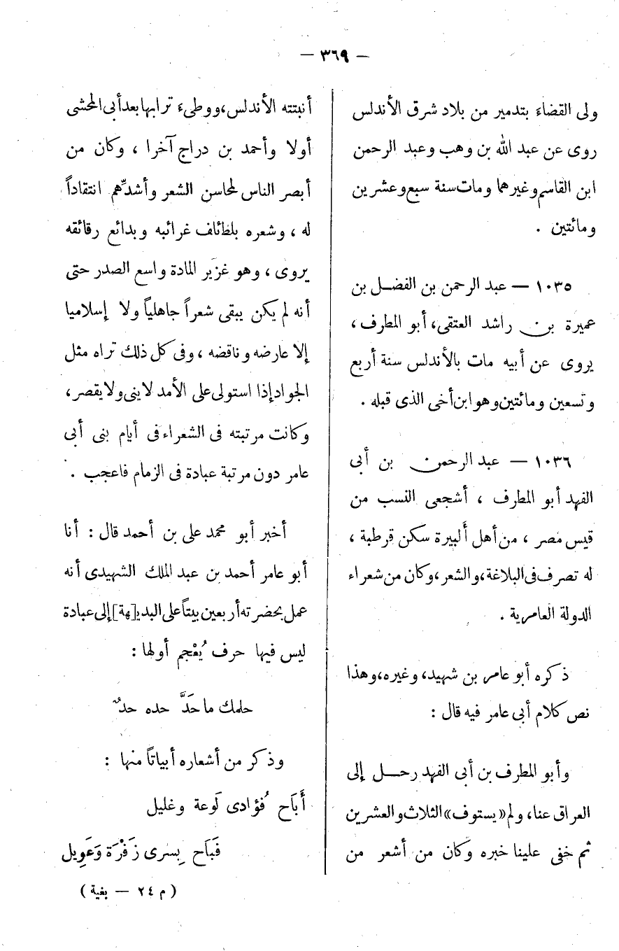 وأبو المطرف بن أبي الفهد رحل إلى العراق عنا، ولم "يستوف" الثلاث والعشرين ثم خفى علينا خبره وكان من أشعر من أنبتته الأندلس، ووطئ ترابها بعد أبي المحشي أولاً وأحمد بن دراج آخراً، وكان من أبصر الناس لمحاسن الشعر وأشدهم انتقاداً له، وشعره بلطائف غرائبه وبدائع رقائقه يروى، وهو غزير المادة واسع الصدر حتى أنه لم يكن يبقى شعراً جاهلياً ولا إسلامياً إلا عارضه وناقضه، وفي كل ذلك تراه مثل الجواد إذا استولى على الأمد لا يني ولا يقصر، وكان مرتبته في الشعراء في أيام بني أبي عامر دون مرتبة عبادة في الزمام فأعجب.