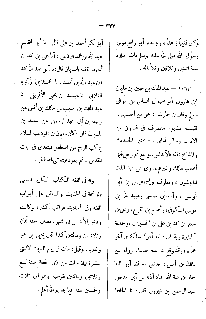 من موالي سليم وقال ابن حارث: هو من أنفسهم، فقيه مشهور متصرف في فنون من الآداب وسائر المعاني، كثير الحديث والمشايخ، تفقه بالأندلس وسمع ثم رحل فلقي أصحاب مالك وغيرهم، روى عن عبد الملك الماجشون، ومطرف وإسماعيل بن أبي أويس، وأسد بن موسى وعبيد الله بن موسى الكوفي، وأصبغ بن الفرج، وعلي بن جعفر بن محمد بن علي بن الحسين، وجماع كثيرة ويقال: إنه أدرك مالكاً في آخر عمره، وقد وقع لنا عنه حديث رواه عن مالك بن أنس، حدثني الحافظ أبو الثنا حماد بن هبة الله بن حماد أذنا عن أبي منصور عبد الرحمن بن خيرون قال: أخبرنا الحافظ أبو بكر أحمد بن علي قال: أخبرنا أبو القاسم عبد الله بن محمد الرفاعي، أخبرنا علي بن محمد بن أحمد الفقيه بأصبهان قال: أخبرنا أبو عبد الله محمد بن عبد الله بن أسيد، أخبرنا محمد بن زكريا الغلابي، أخبرنا عبيد بن يحيى الأفريقي، أخبرنا عبد الملك بن حبيب عن مالك بن أنس عن ربيعة بن أبي عبد الرحمن عن سعيد بن المسيب قال: كان سليما بن داود) عليه السلام (يركب الريح عن اصطخر فيتغدى في بيت المقدس، ثم يعود فيتعشى باصطخر.