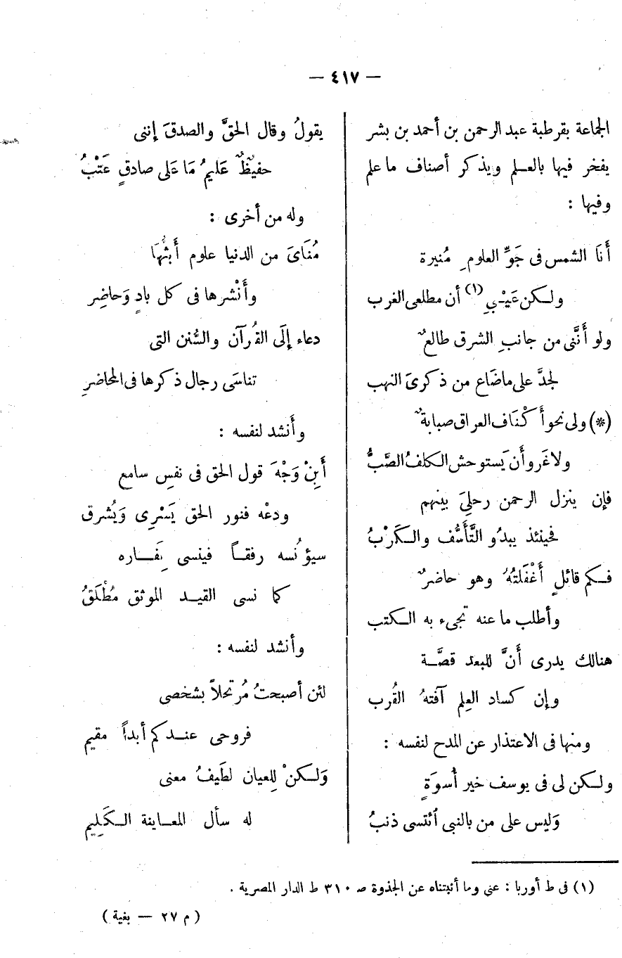 الجماعة بقرطبة عبد الرحمن بن أحمد بن بشر يفخر فيها بالعلم ويذكر أصناف ما علم وفيها: