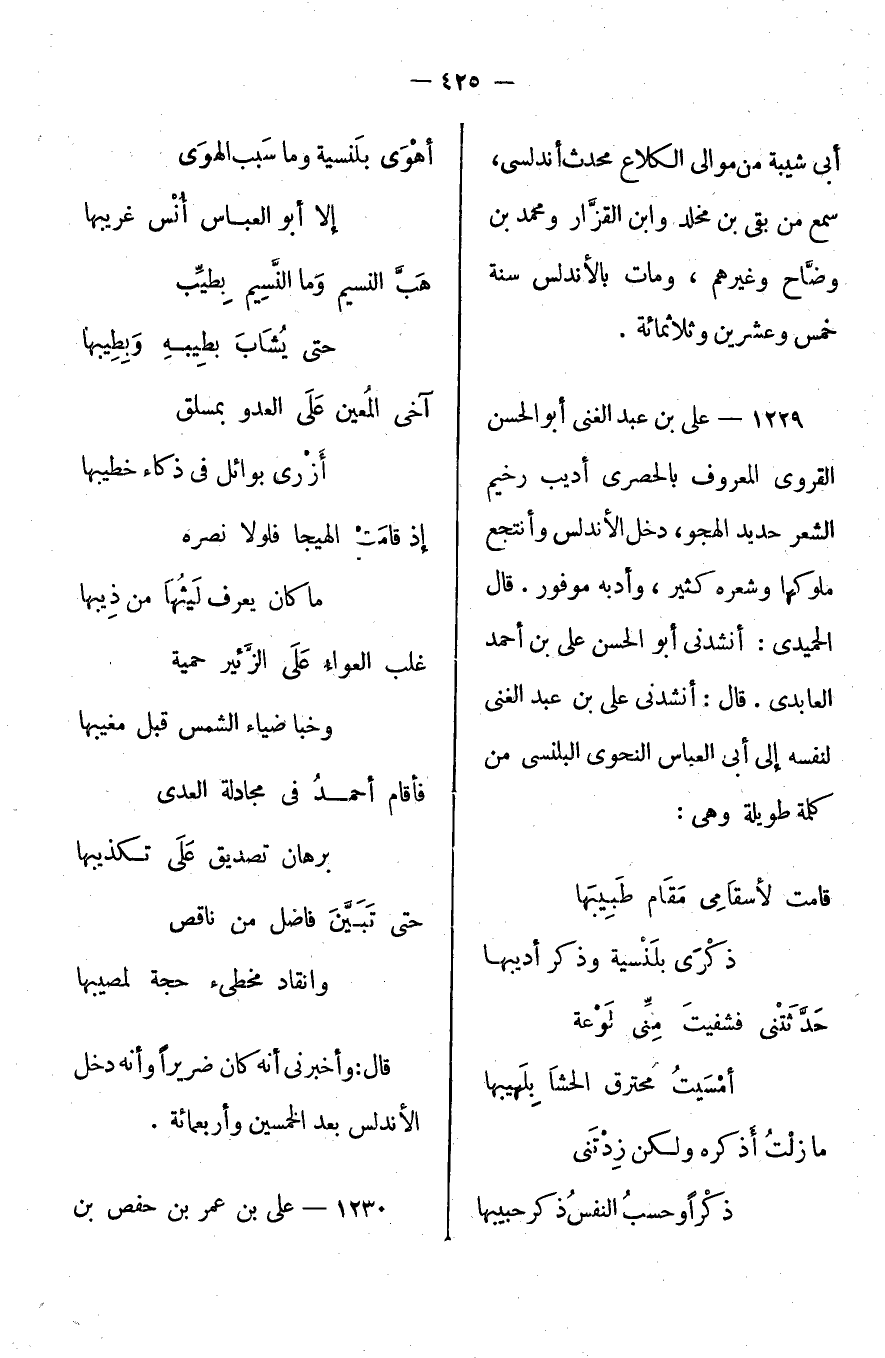 قال الحميدي: أنشدني أبو الحسن علي بن أحمد العابدي، قال: أنشدني علي بن عبد الغني لنفسه إلى أبي العباس النحوي البلنسي من كلمة طويلة وهي: