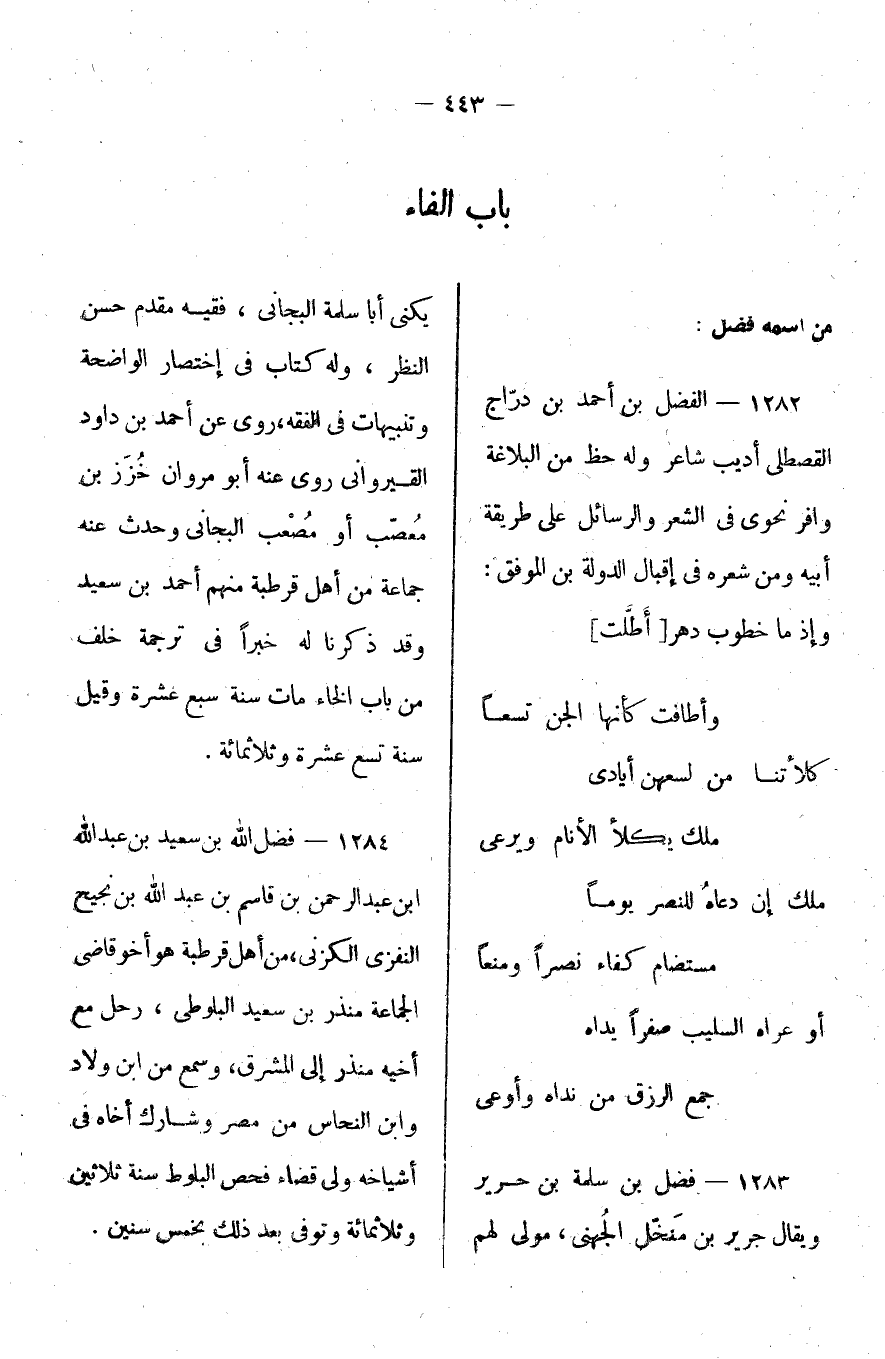 ! 282- الفضل بن أحمد بن دراج القصطلي: أديب شاعر وله حظ من البلاغة وافر نحوي في الشعر والرسائل على طريقة أبيه ومن شعره في إقبال الدولة بن الموفق: