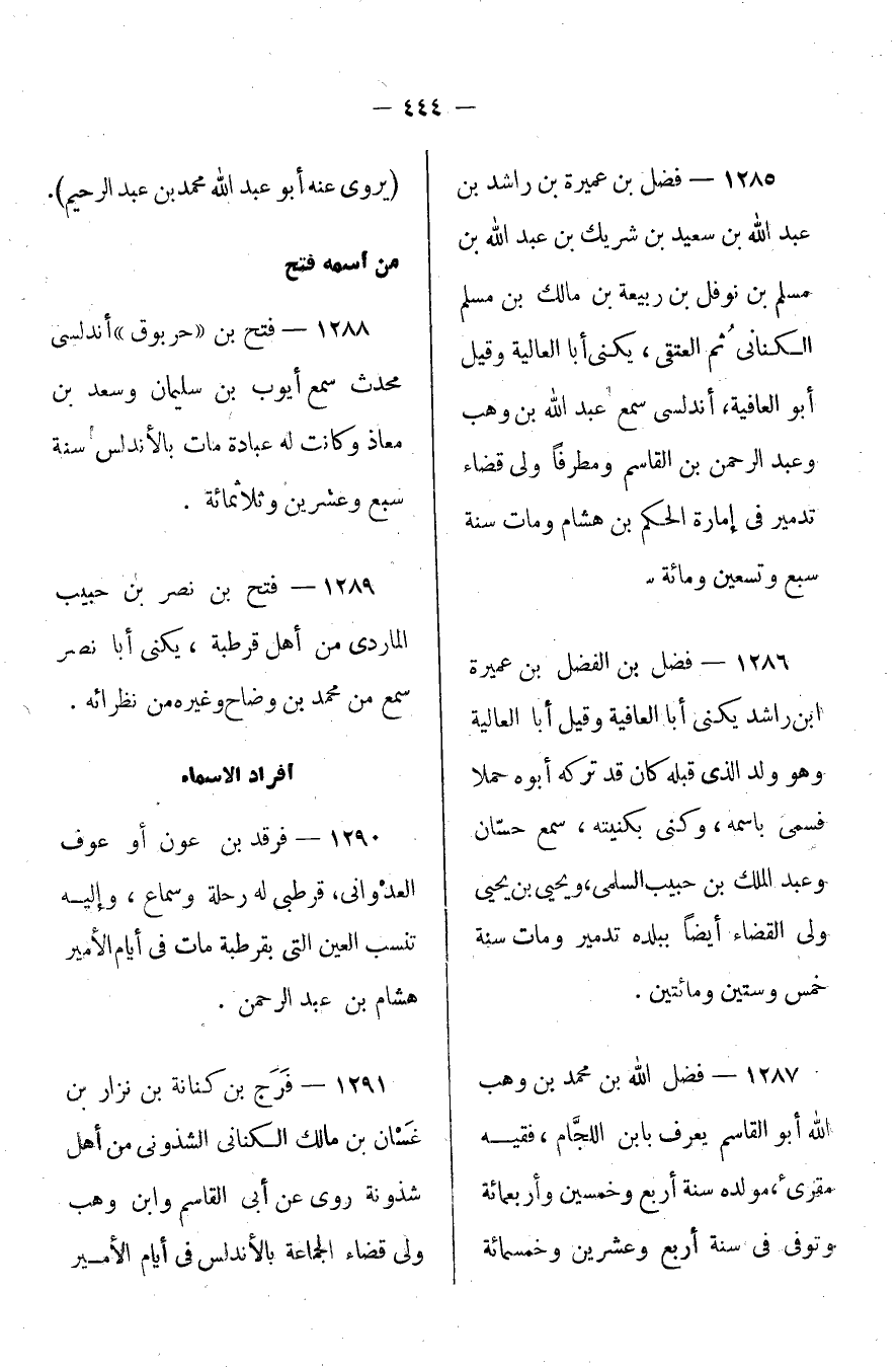 1289- فتح بن نصر بن حبيب الماردي، من أهل قرطبة، يكنى أبا نصر سمع من محمد بن وضاح وغيره من نظرائه.