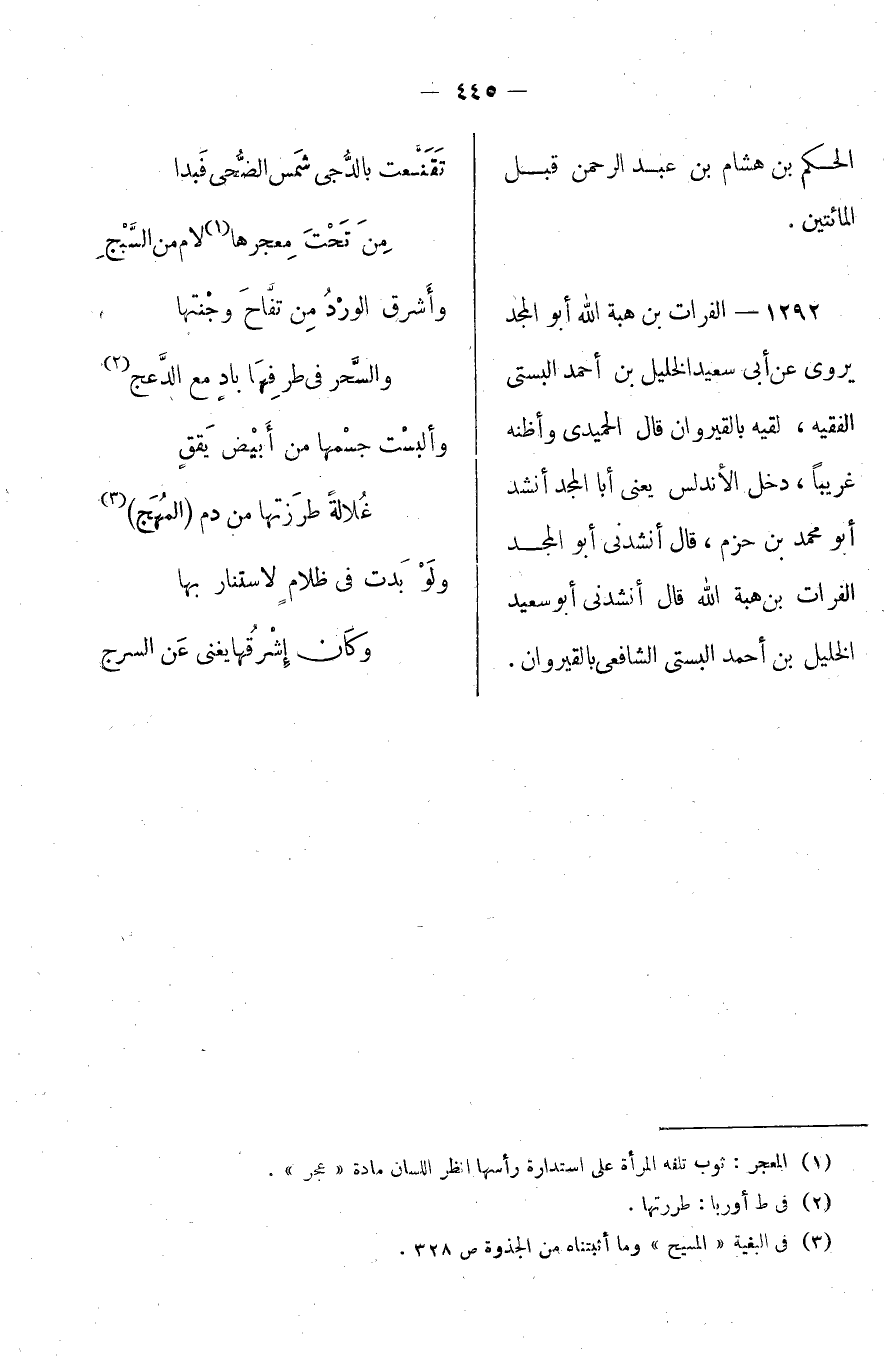 يروى عن أبي سعيد الخليل بن أحمد البستي الفقيه، لقيه بالقيروان قال الحميدي: وأظنه غريباً دخل الأندلس يعني أبا المجد، أبو محمد بن حزم، قال: أنشدني أبو المجد الفرات بن هبة الله قال: أنشدني أبو سعيد الخليل بن أحمد البستي الشافعي بالقيروان: