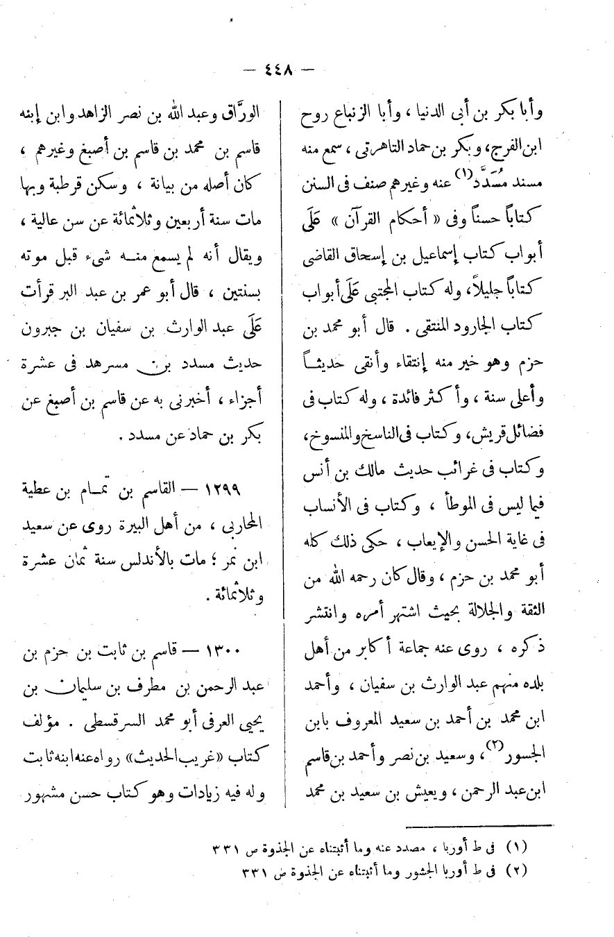 وأبا بكر بن أبي الدنيا، وأبا الزنباع روح بن الفرج وبكر بن حماد التاهرتي، سمع منه مسند مسدد عنه وغيرهم، صنف في السنن كتاباً حسناً وفي "أحكام القرآن" على أبواب كتاب إسماعيل بن إسحاق القاضي كتاباً جليلاً، وله كتاب المجتبى على أبواب كتاب الجارود المنتقى. قال أبو محمد بن حزم: وهو خير منه انتقاء وأنقى حديثاً وأعلى سنة وأكثر فائدة، وله كتاب في فضائل قريش، وكتاب في الناسخ والمنسوخ، وكتاب في غرائب حديث مالك بن أنس فيما ليس في الموطأ، وكتاب في الأنساب في غاية الحسن والإيعاب، حكى ذلك كله أبو محمد بن حزم، وقال: كان رحمه الله من الثقة والجلالة بحيث اشتهر أمره وانتشر ذكره، روى عنه جماعة أكابر من أهل بلده منهم عبد الوارث بن سفيان وأحمد بن محمد بن أحمد بن سعيد المعروف بابن الجسور وسعيد بن نصر وأحمد بن قاسم بن عبد الرحمن ويعيش بن سعيد بن محمد الوراق وعبد الله بن نصر الزاهد وابن ابنه قاسم بن محمد بن قاسم بن أصبغ وغيرهم، وكان أصله من بيانة، وسكن قرطبة وبها مات سنة أربعين وثلاثمائة عن سن عالية، ويقال أنه لم يسمع منه شيء قبل موته بسنتين، قال أبو عمر بن عبد البر: قرأت على عبد الوارث بن سفيان بن جبرون حديث مسدد بن مسرهد في عشرة أجزاء، أخبرني به عن قاسم بن أصبغ عن بكر بن حماد عن مسدد.